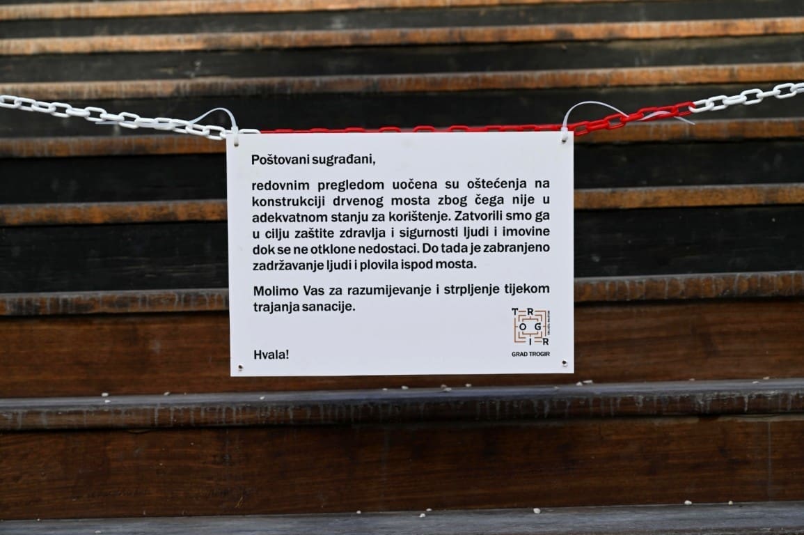 Od utorka, 24. studenog, zatvara se drveni most preko trogirske Foše te se zabranjuje zadržavanje ljudi i povila ispod mosta. Naime, redovnim pregledom utvrđena su značajna oštećenja u konstrukciji, a dodatnim pregledom ovlaštenog inženjera isto je i potvrđeno te je procijenjeno da su nosivost i stabilnost mosta nedostatne zbog čega most nije u adekvatnom stanju za korištenje. U cilju očuvanja sigurnosti i zdravlja građana, Gradska uprava odlučila je do daljnjega zatvoriti most.