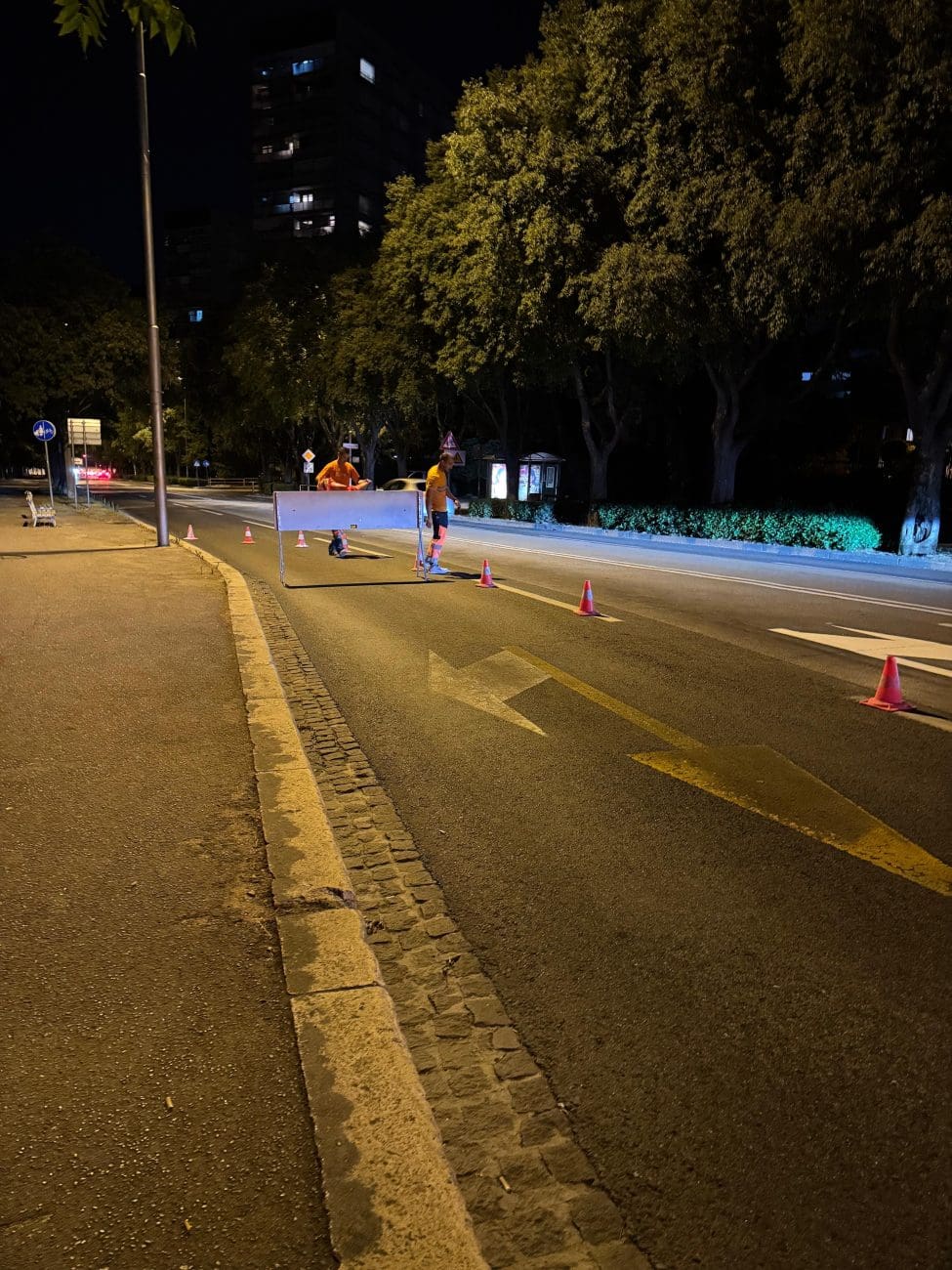 U nedjelju navečer u splitskoj Ulici Sedam Kaštela, u blizini raskrižja s Matoševom, privremeno je zatvoren jedan kolnički trak zbog radova na obnovi horizontalne prometne signalizacije. Radnici tvrtke Cestar, odjeveni u reflektirajuće prsluke i uz odgovarajuću prometnu opremu, iscrtavali su oznake na kolniku, uz jasno postavljene prometne čunjeve koji su usmjeravali vozače i pješake.