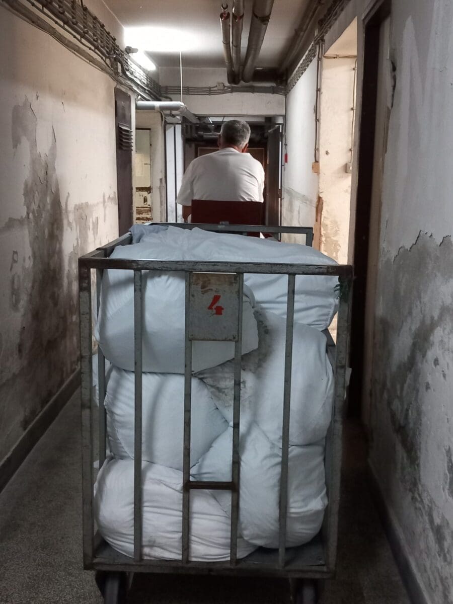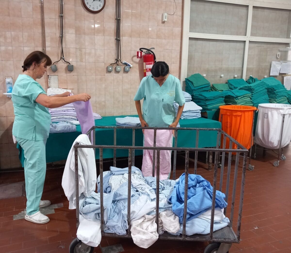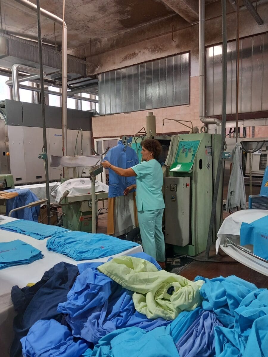 Među njima su i vrijedni djelatnici praonice rublja, njih 60-ak, koji brinu o opskrbi, pranju, peglanju i popravku tekstila splitske bolnice. Dnevno obrade gotovo 5 tona tekstila koji prođe ovaj put: Transportni radnik skuplja nečistu robu po odjelima te je dovozi u praonicu. Tu se ona razvrstava i stavlja na pranje u tunelsko postrojenje ili pojedinačne strojeve. Roba s pranja izlazi u odvojeni dio odjela za čisti tekstil gdje ju se na traci razvrstava prema namjeni obrade, na glačanje ili sušenje. Kad je roba obrađena skladišti se i transportni je radnik vozi natrag prema odjelima.