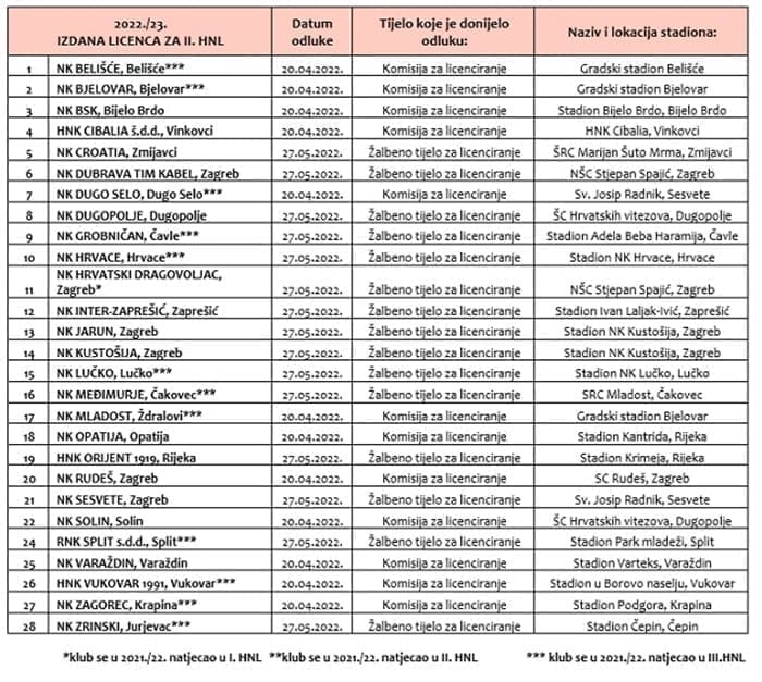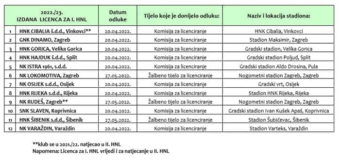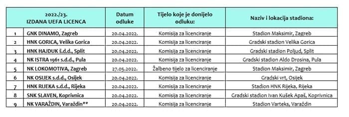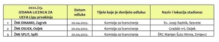 Hrvatski nogometni savez kao davatelj licence završio je 19. po redu Središnji postupak licenciranja klubova za natjecateljsku 2022./23. godinu. za UEFA klupska natjecanja, uključujući UEFA Ligu prvakinja, te natjecanje u Prvoj HNL i u Drugoj HNL.