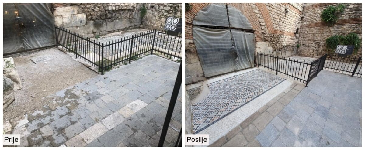 Međutim, adekvatno rješenje odvodnje cijelog platoa će svakako pridonijeti manjem zadržavanju vode na mozaiku te spriječiti daljnje propadanje tog arheološkog lokaliteta zbog vlage. Riječ je o jednoj od najznačajnijih mozaičnih površina pronađenih u Dioklecijanovoj palači, a čija potpuna konzervacija tek predstoji.