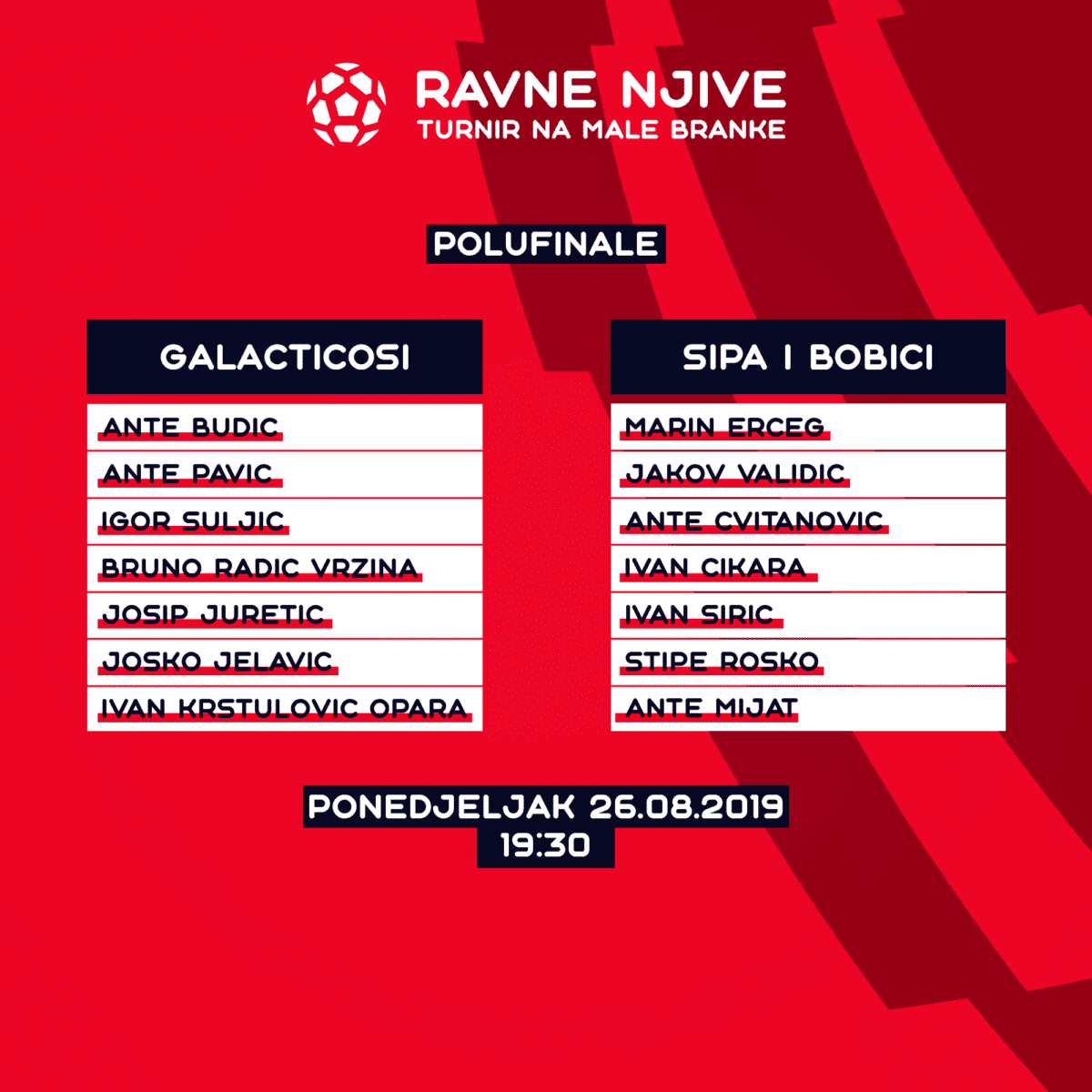 Turnir na Ravnim Njivama polako dolazi svome kraju. Navečer su odigrane polufinalne utakmice između kvartovske momčadi Galacticosi i ekipe Sipa i Bobići (19:30). Sat vremena kasnije na teren su izašli Čizmini Momci koji su igrali protiv ekipe Tri Gracie.