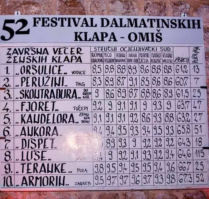 Publici na prepunoj omiškoj pjaci uvjerljivo najviše svidjela se klapa Luše iz Splita. Mlade debitantice, naime, osvojile su više nego dvostruko glasova od drugoplasiranih Armorinki dok je brončani Leut otišao u ruke klape Ankora.