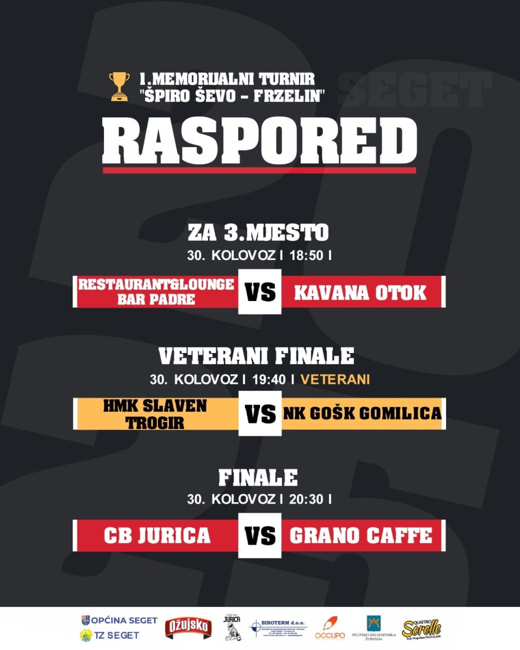 Na igralištu u Segetu u subotu, 30. kolovoza, odigrat će se završne utakmice I. Memorijalnog turnira "Špiro Ševo – Frzelin". Turnir, koji je kroz protekle dane okupio brojne ekipe i ljubitelje malog nogometa, završava s tri atraktivna susreta.