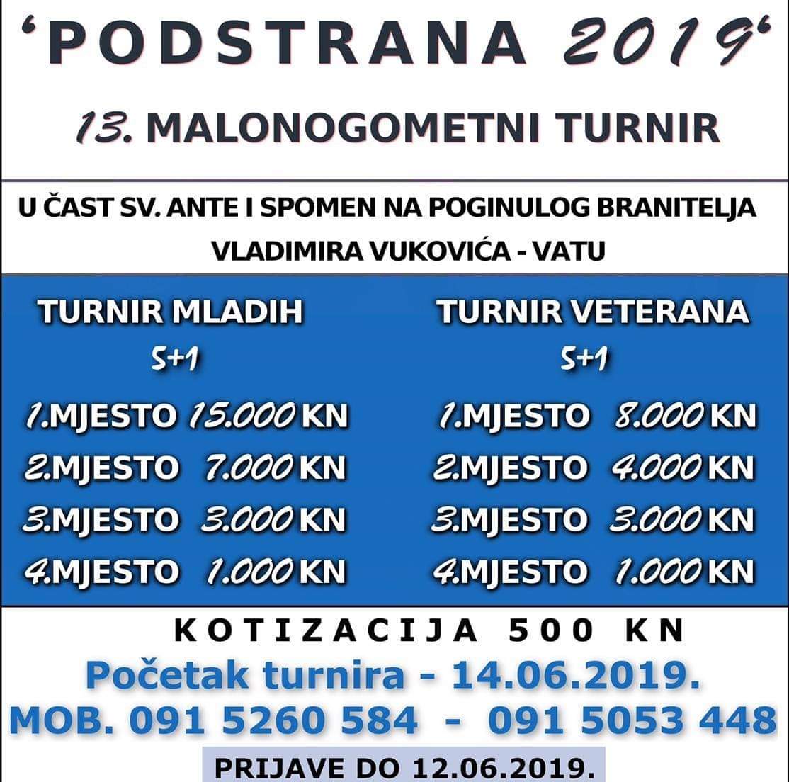 Danas se igra završnica 13. tradicionalnog malonogometnog turnira Podstrana 2019 koji se igra u čast Svetog Ante i na spomen poginulom branitelju Vladimiru Vukoviću Vati.