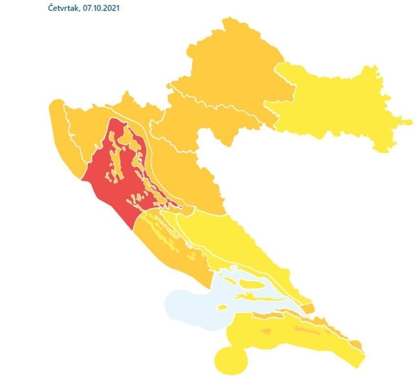Nakon juga će zapuhati bura, podno Velebita od četvrtka olujna s orkanskim udarima, a vjetrovito će biti i u unutrašnjosti. Stoga će osim upozorenja za obilnu kišu i izražene grmljavinske pljuskove, biti i onih za vjetar. Razine upozorenja pratite ovdje.