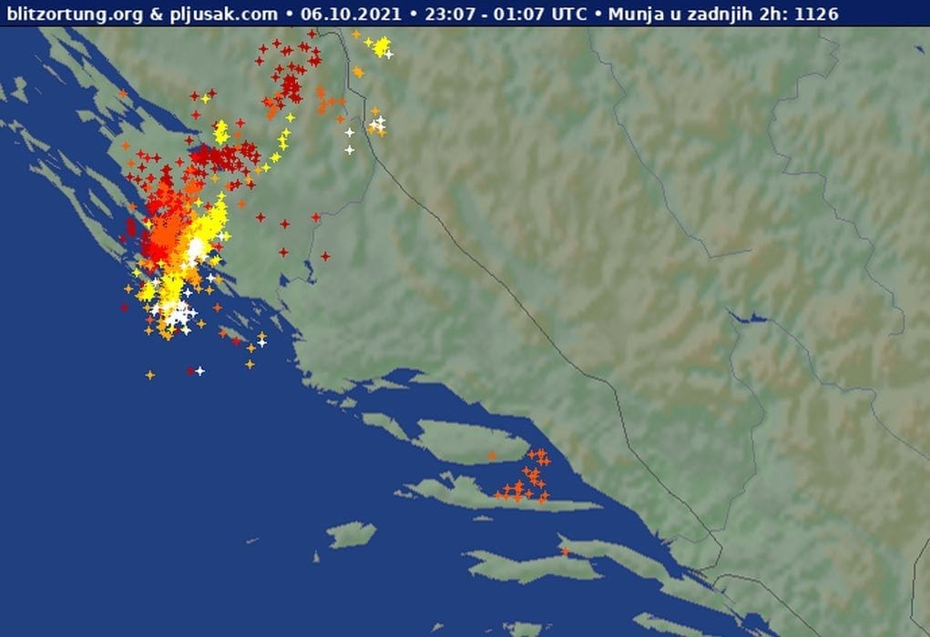 Do 1 sat iza ponoći obilne oborine pale su na sjeveru Dalmacije. Prema podacima mreže Pljusak.com, 64 litre po kvadratnom metru pale su u Starigradu Paklenici. Pag je dobio 38, Sveti Rok 36, Crni vrh 28 itd.