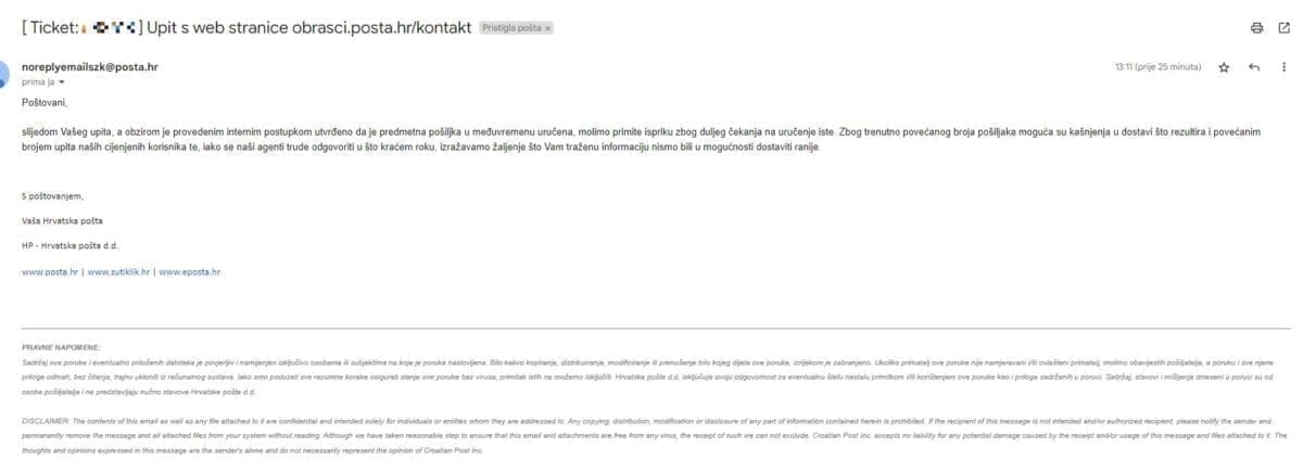 I to nonšalantan odgovor u uvijek istu ispriku "...zbog trenutno povećanog broja pošiljaka moguća su kašnjenja u dostavi što rezultira i povećanim brojem upita naših cijenjenih korisnika...".