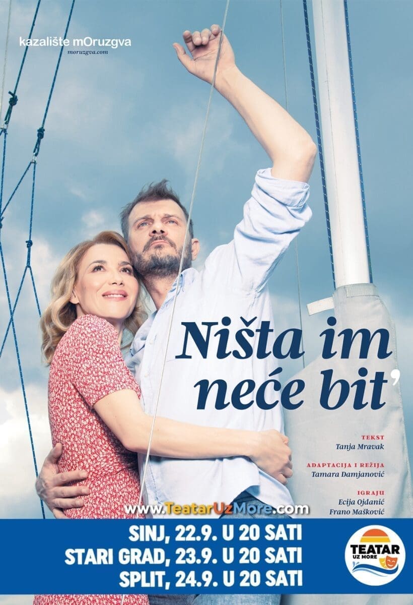 Zatvaranje ljetnog festivala Teatar uz more u Splitu održat će se ove nedjelje 24. rujna u 20 sati uz najnoviju komediju kazališta Moruzgva "Ništa im neće bit' ". Zbog najavljenih nepovoljnih vremenskih prilika Ecija Ojdanić i Frano Mašković zaigrat će u dvorani Lora umjesto na ljetnoj sceni u Lori.