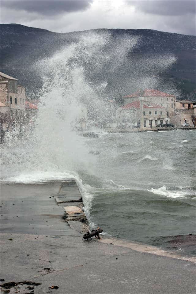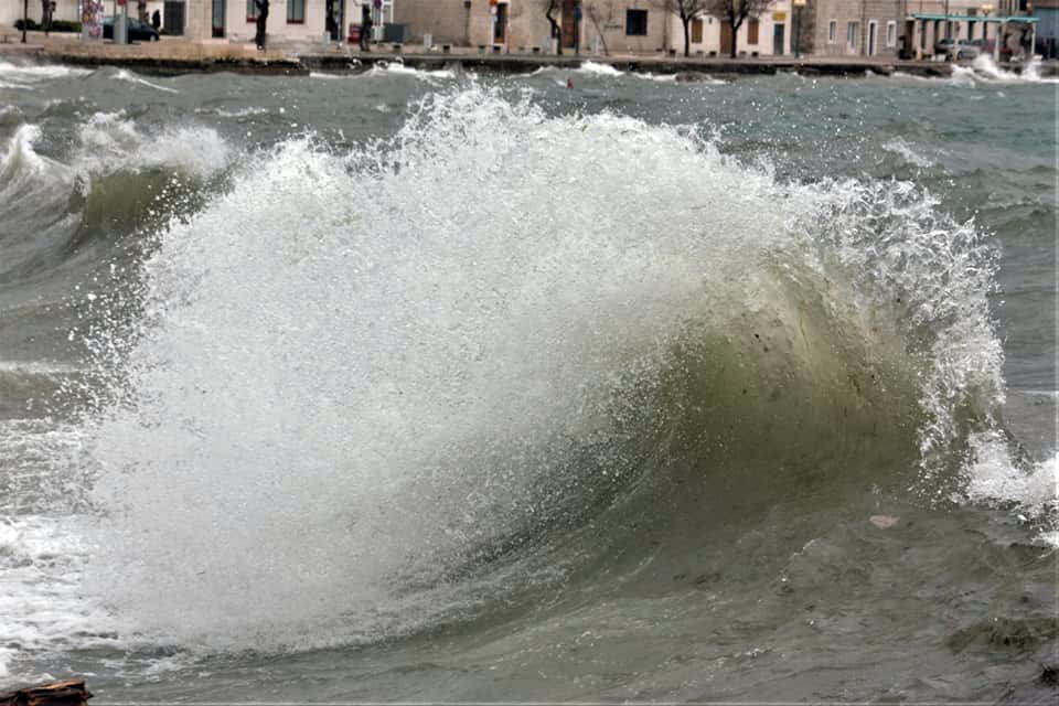 Jugo puše i u Kaštelima, a atraktivne prizore valova koja se dižu i nekoliko metara nakon što udaru o rivu, snimio je fotograf i lovac na oluje Frane Vukušić.