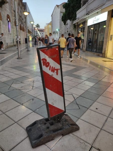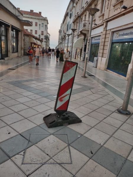 Pomalo bizarna situacija već danima se događa u samom centru Splita. Naime na sred Marmontove ulice već neko vrijeme stoji znak iz kojeg se može zaključiti da se na toj lokaciji obavljaju neki građevinski radovi. No, kako smo primijetili, ništa se ne događa, radovi se ne obavljaju, a znak stoji svaki dan na identičnoj lokaciji na središtu poznate splitske ulice.