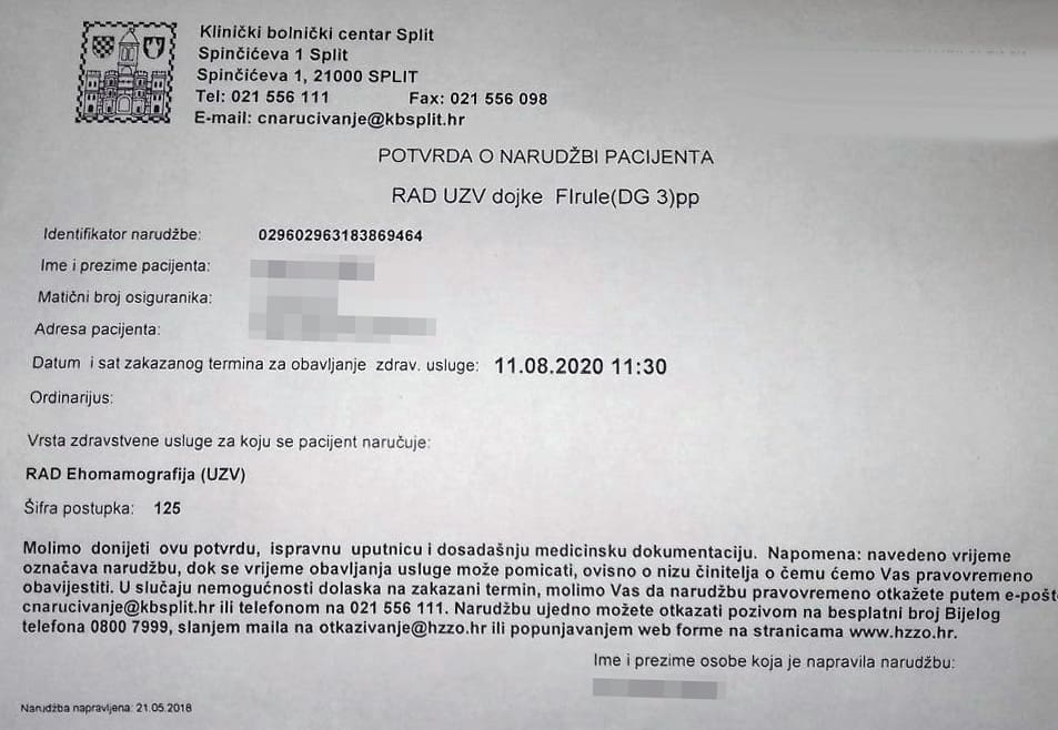 Od tada redovito ide na liječničke preglede i drži se svih uputa koje su joj liječnici dali. Prije nekoliko dana pošla je u splitsku bolnicu upisati se za ultrazvuk dojke, a kada je dobila potvrdu od narudžbi, nije mogla vjerovati što piše na njoj. Datum zakazanog pregleda je 11. kolovoza 2020. godine.