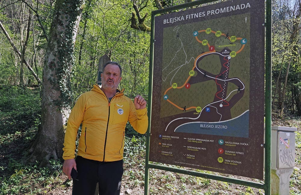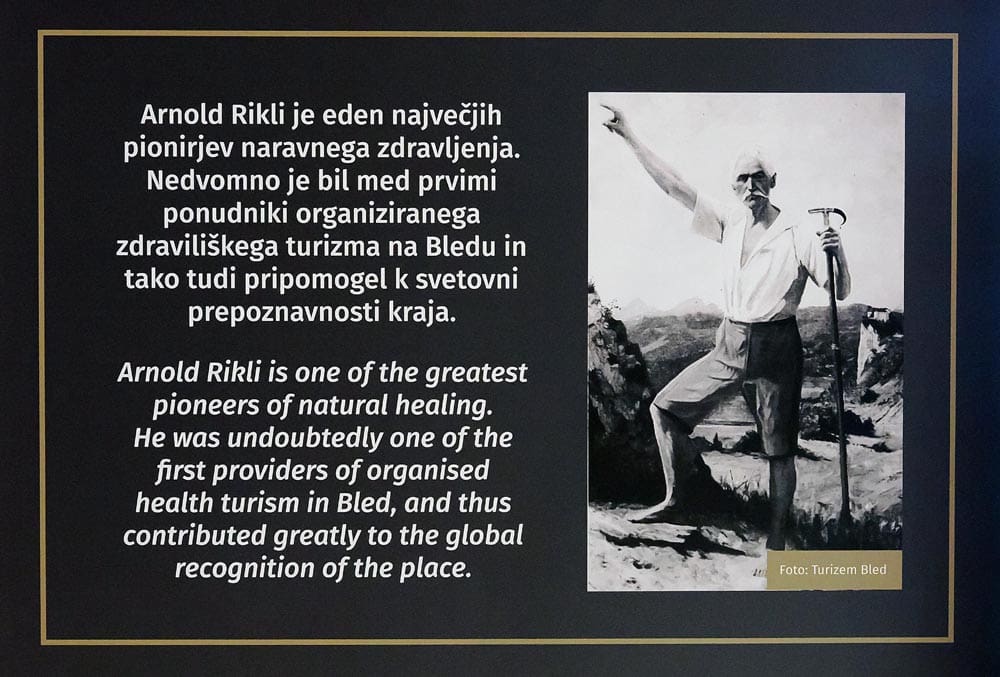 "Arnold Rikli bio je švicarski naturopat koji je kao mladić došao na Bled te se uz pomoć sunca, vode i svježeg zdravlja samoizliječio. Svoje je iskustvo prenosio dalje pa je vrlo brzo njegova metoda 'liječenja' postala svjetski poznata. Iako vrlo kontroverzan, on i njegova metoda Bled su u drugoj polovici 19 stoljeća pretvorili u odredište zdravstvenog turizma" - kaže Martin na početku nekad Riklijeve, a danas Bledske fitness promenade. Ona kroz blagu uzvisinu vodi sve do vrha Straža (inače Bledsko jezero okružuje tri brda - spomenuta Straža, Ojstrica i Osojnica) s kojeg puca pogled na cijeli Bled ali i na zelene atrakcije koje ova destinacija nudi u toplijem dijelu godine- adrenalinsko sanjkanje, fitness na proplancima ili livadama.