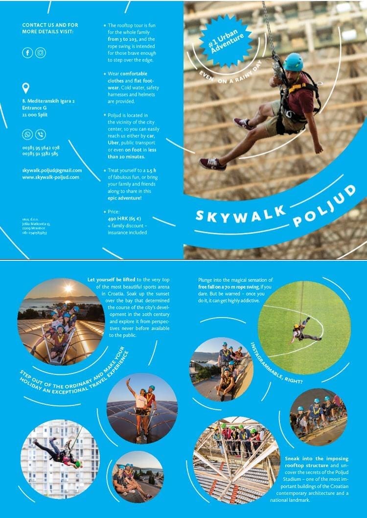 "Jedinstveno iskustvo poljudskog stadiona, gdje ga možete istražiti uz perspektivu koja dosad nije bila dostupna javnosti. Moći ćete hodati po krovu stadiona i zaviriti u tajne ovog fascinantnog objekta, a sve završava skokom s užeta koje je dugačko 70 metara", stoji u opisu poljudskog Skywalka.