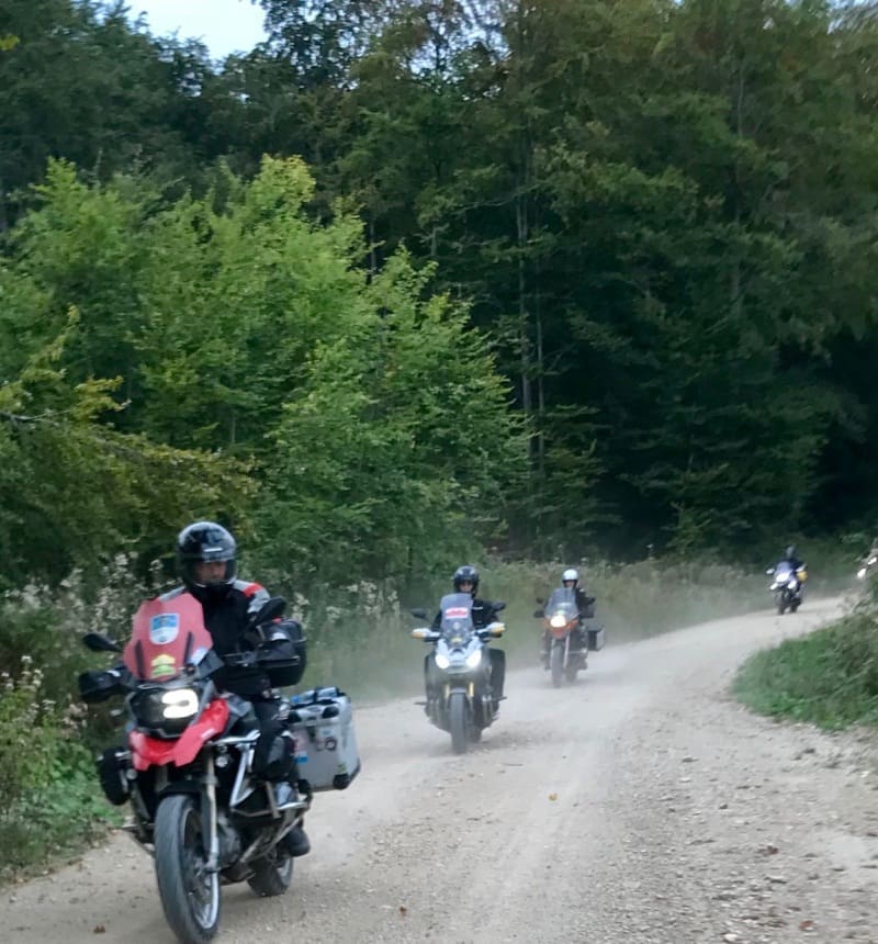 Većina nas je na enduro motorima, samo je Mario Maleš na cestovnom motoru BMW GT 1600 koji dobro savladava makadam uz malo sporiju vožnju, dok X ADV praši punim gasom i Pirelli gume sada dolaze na svoje.