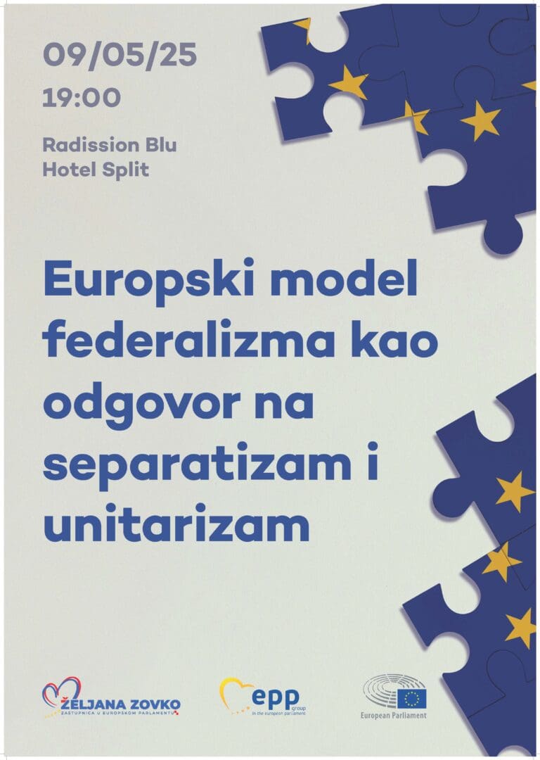 Zastupnica u Europskom parlamentu i potpredsjednica Kluba zastupnika EPP-a Željana Zovko organizirat će u petak, 9. svibnja 2025. godine konferenciju pod nazivom "Europski model federalizma kao odgovor na separatizam i unitarizam". Konferencija će se održati u Radisson Blu Hotelu Split, s početkom u 19:00 sati.