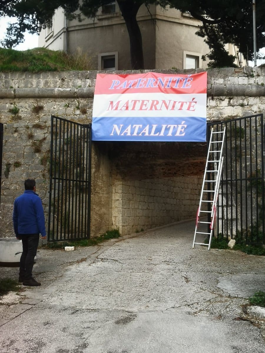 Povodom Noći muzeja, večeras je postavljena ambijentalna instalacija 'Paternite, maternite, natalite', u formi bannera 440 x 220 cm, nad ulaznim vratima tvrđave na Gripama, gdje će ostati naredna dva tjedna. Autor je Ante Kuštre.