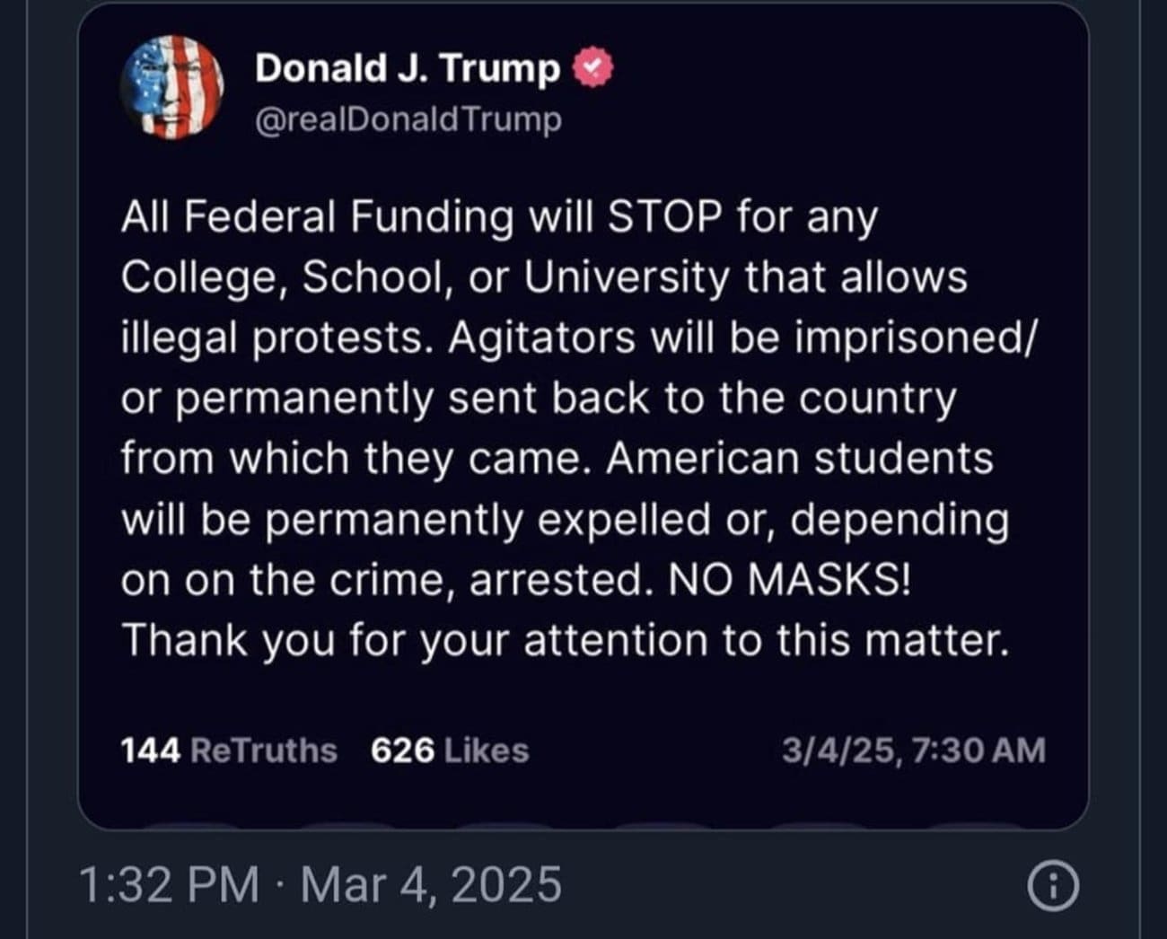 Donald Trump izjavio je u utorak kako planira ukinuti sva savezna sredstva za fakultete i škole koje dozvoljavaju prosvjede koje je nazvao "ilegalnima". Prema njegovim riječima, studenti koji sudjeluju u takvim prosvjedima bit će trajno izbačeni iz obrazovnih institucija ili, ovisno o težini prekršaja, suočeni s uhićenjem.