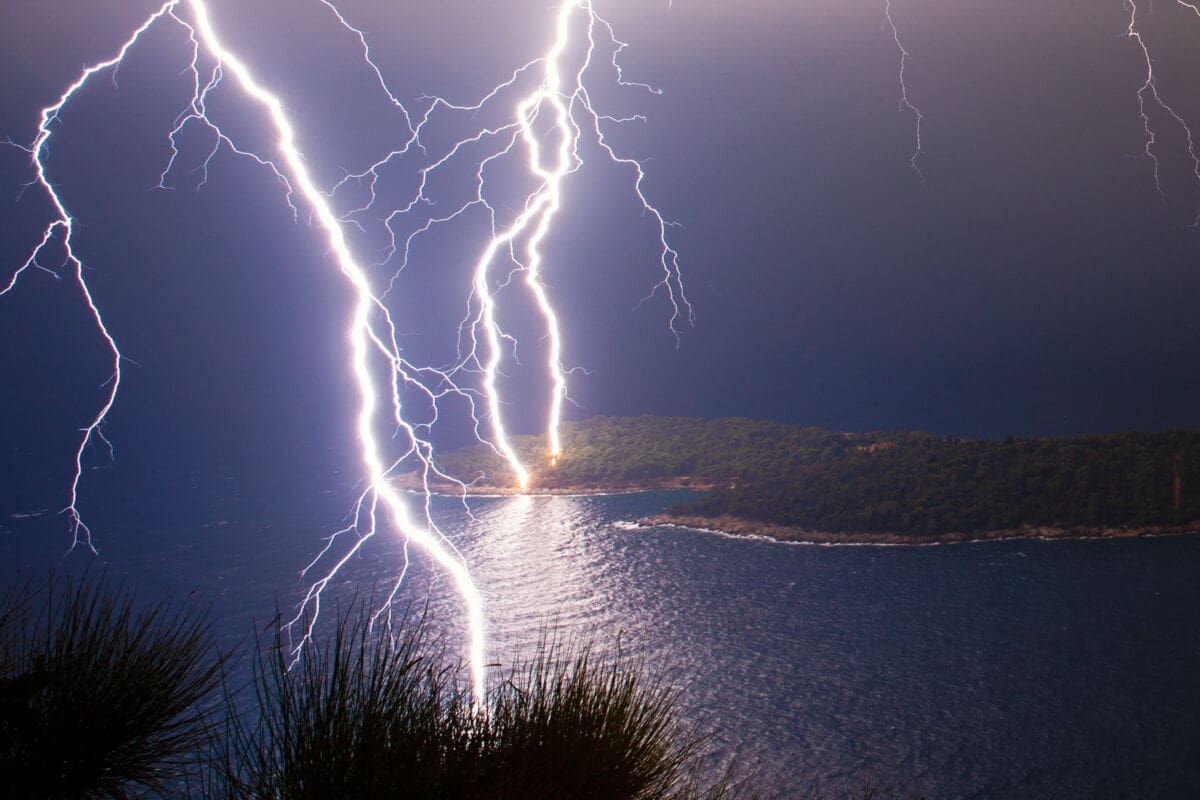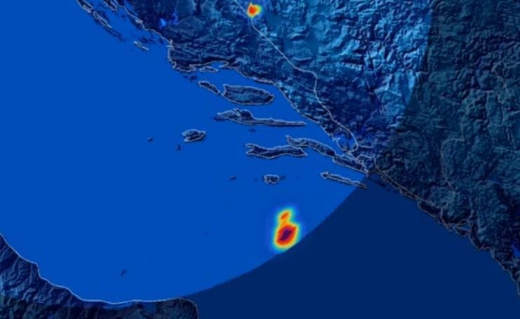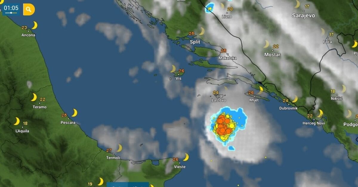 U Dalmaciji je do 1 sat iza ponoći pljuskova bilo uglavnom na području Dinare i Peruće, ali i nad otvorenom morem.