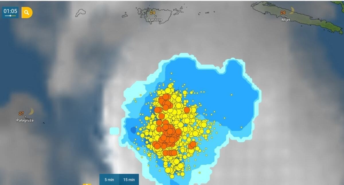 Iza ponoći južnije od Lastova razvio se olujni sustav koji je području otvorenog mora donio silovito nevrijeme. Sudeći prema radarskim i satelitskim snimkama, ispod njega ima tuče, vjerojatno i pijavica. S obzirom da je ovaj olujni oblak vidljiv na radaru koji se nalazi u Zadru, procjenjuje se da ovaj sustav sadrži kumulonimbuse čija visina doseže desetak kilometara.