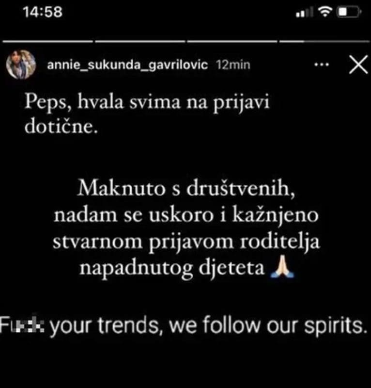 - Ljudi, hvala svima na prijavi. Maknuto s društvenih, nadam se uskoro i kažnjeno stvarnom prijavom roditelja napadnutog djeteta - napisala je.