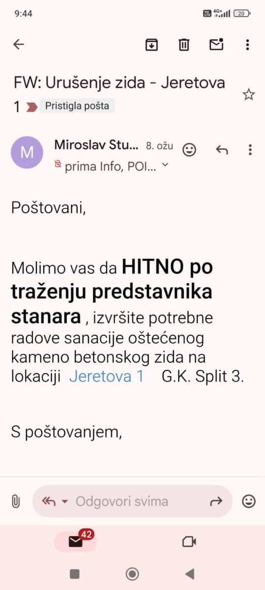 Kaže da ne bi išla u javnost sa svojim imenom jer da to nije bitno, problem je zid. Pokušala je ostvarit komunikaciju s predstavnikom Jeretove 3, ali bez uspjeha. Obratila se i Gradu, komunalcima i tu naišla na zid šutnje. Poslala je mail još u ožujku ali nikakvu povratnu informaciju nije dobila niti je bilo kakvog postupanja osim komunalnog redara koji je dao nalog za uklanjanja drvene ograde.