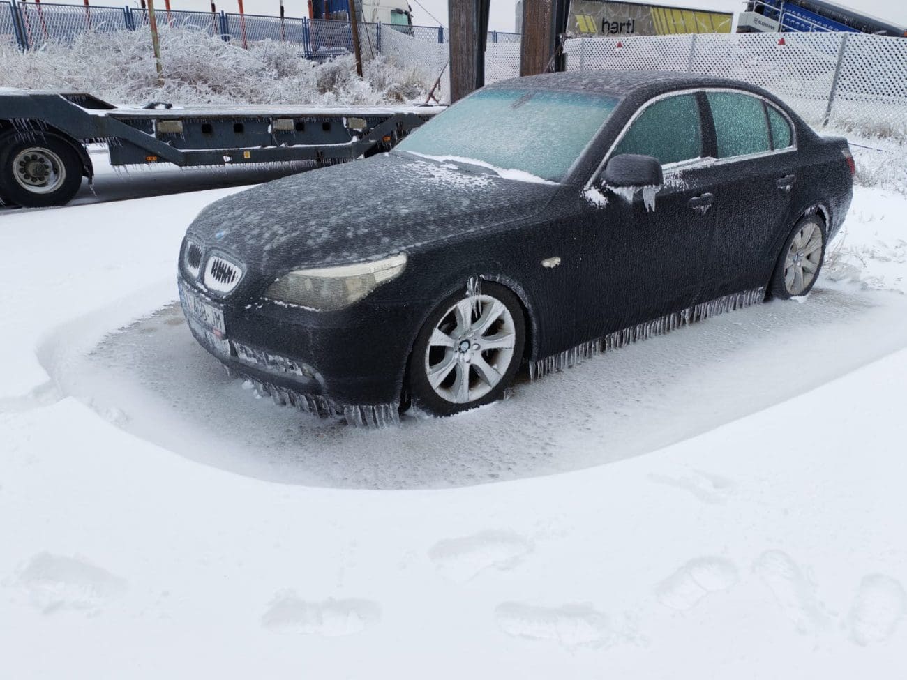 Na fotografiji se vidi koliko su uvjeti u zaleđu zimski: na lijevoj strani automobil je prekriven tankim slojem snijega, a pahulje se naziru i u zraku uz sivo nebo i zaleđeni krajolik u pozadini. Na desnoj fotografiji još je izraženija studen – automobil je "okovan" injem i ledom, vjetrobran je zaleđen, a uz donji rub karoserije formirale su se ledenice, dok se po tlu zadržao snijeg.