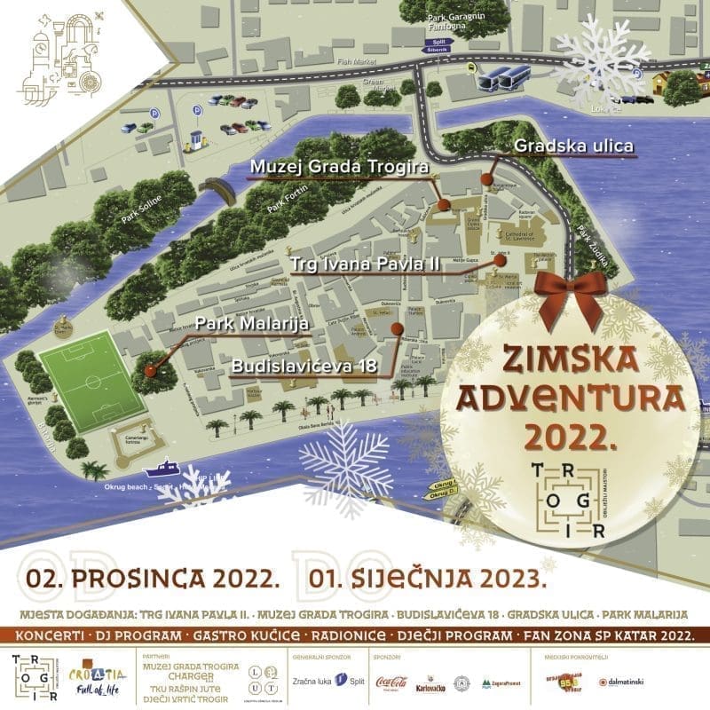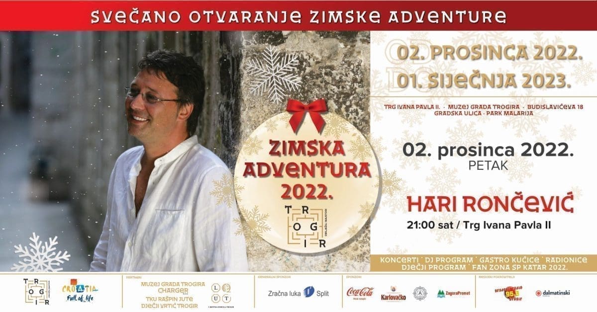 Adventski program Zimske Adventure u Trogiru započinje 2. prosinca koncertom Harija Rončevića na Trgu Ivana Pavla ll, koji će i ove godine biti središnje mjesto zabave i druženja u toplom božićnom ambijentu. Pored toga, drugi izvođači koji će zagrijati blagdansku atmosferu na glavnom gradskom trgu između ostalih su: Amel Ćurić (06.12.), Detour (09.12.), Luka Nižetić (13.12.), Dino Dvornik tribute band (16.12.), Magazin (20.12.), Jura Stublić (23.12.), Matija Cvek (27.12.), Jasna Zlokić (30.12.), dok će naši sugrađani i posjetitelji Novu godinu dočekati u dva termina u jutarnjem od 11 sati Uz Centrifuga Bend, te u večernjem terminu uz Trogirske kante koji će uvesti Trogirane u Novu 2023. godinu uz svečani vatromet.