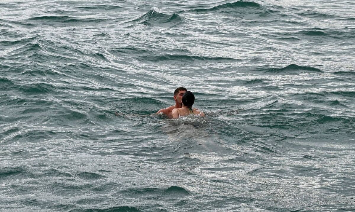 Na kupanje se odlučio jedan par koji je prvo skočio u more, a potom je uslijedio i romantični poljubac. Taj i ostale prizore snimljene danas na Bačama, pogledajte u lijepoj fotogaleriji Vedrana Šegvića.