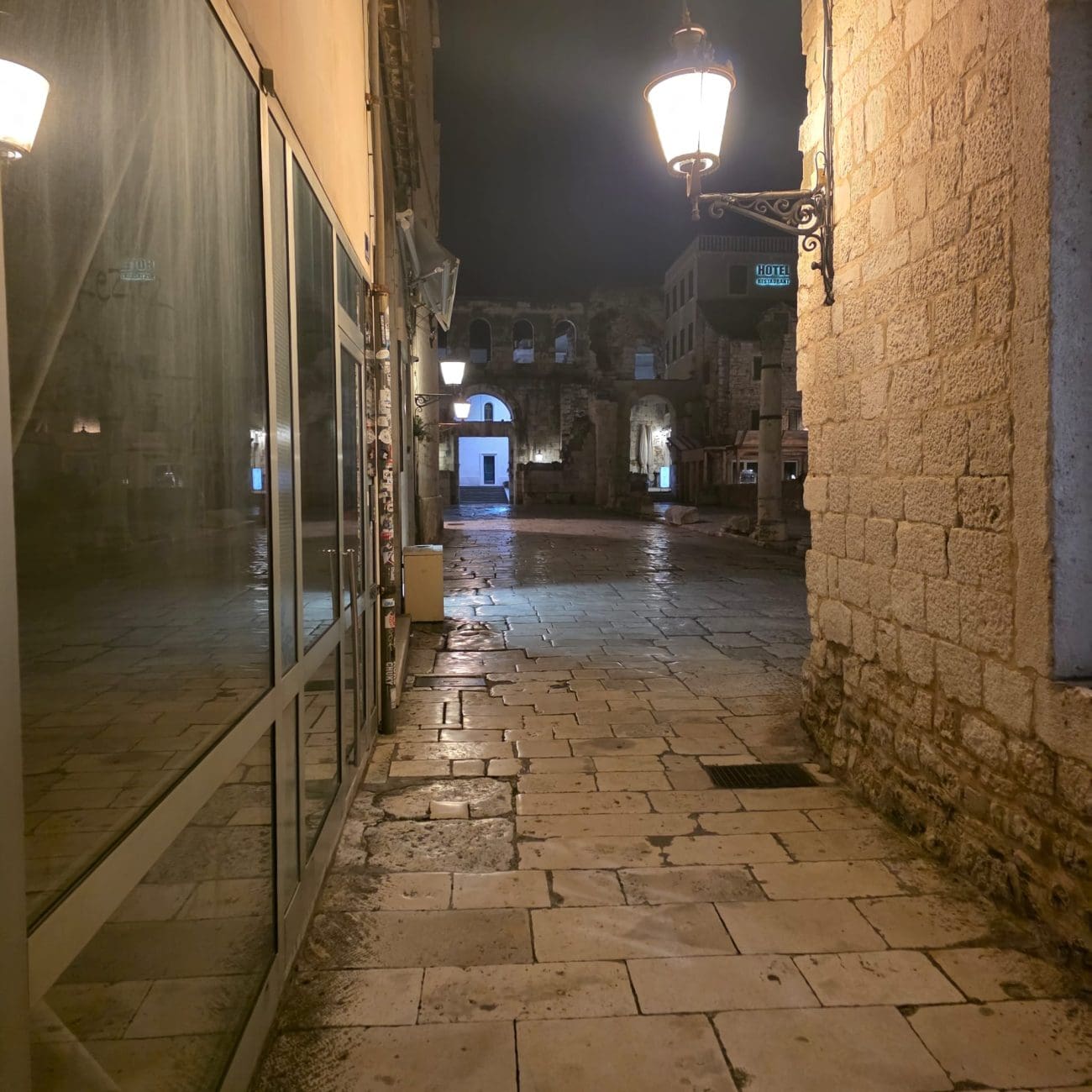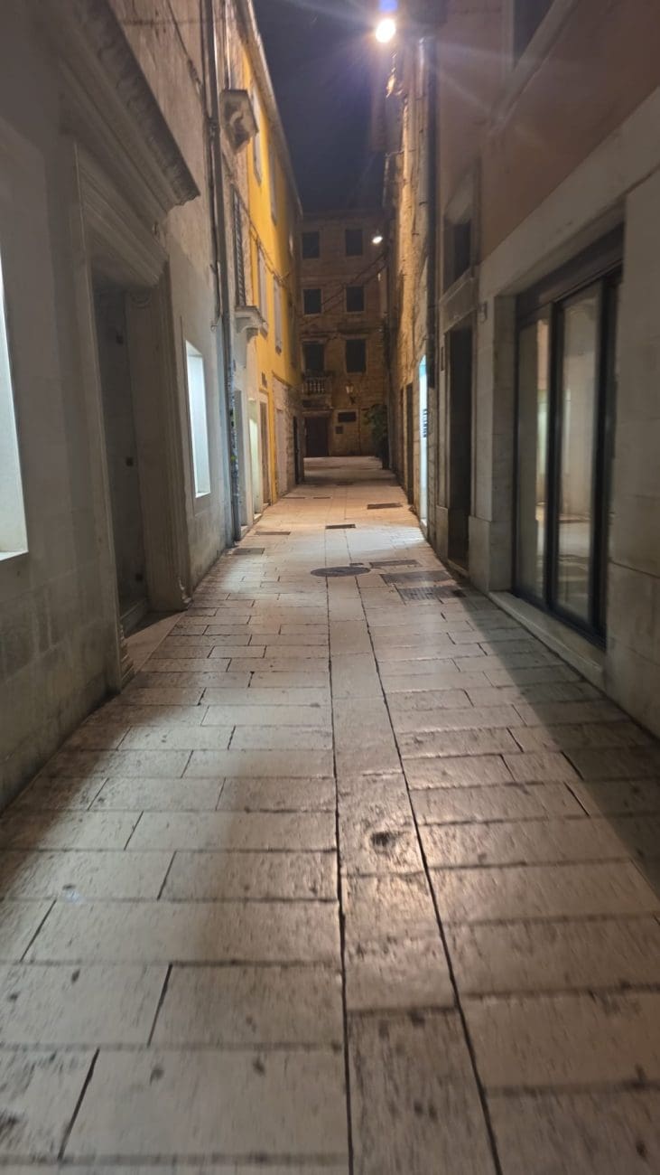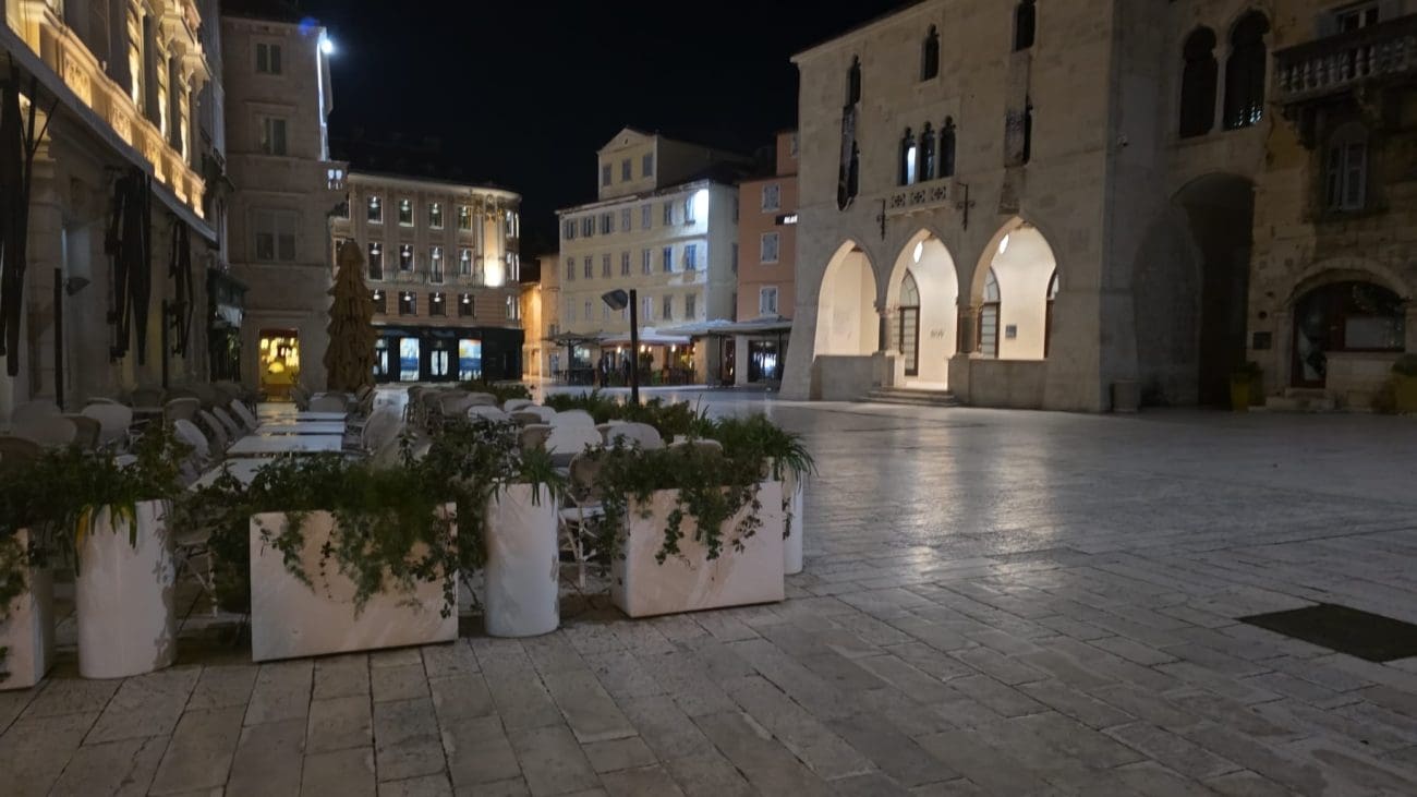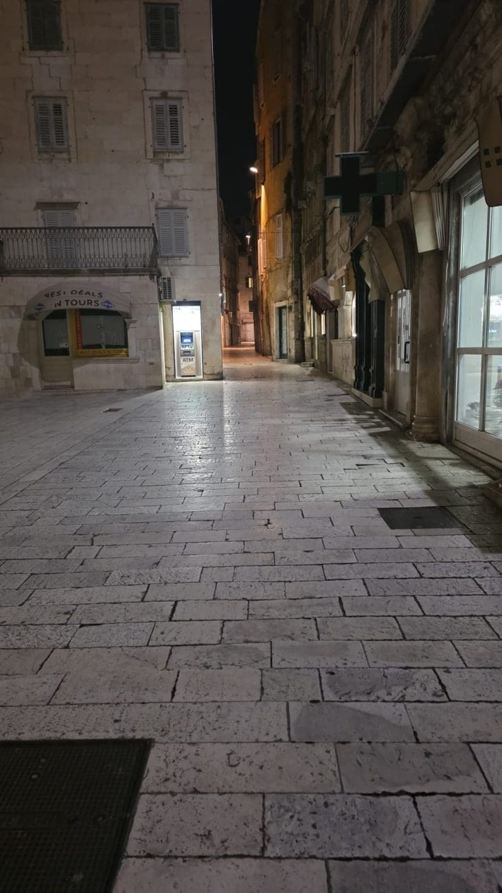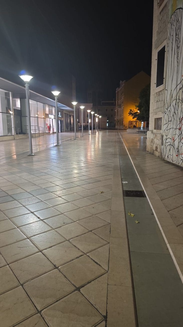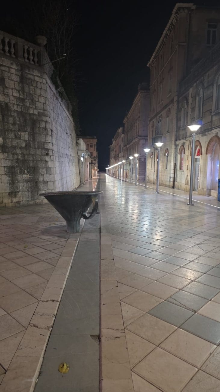 Dok ljetne večeri u Splitu vrve životom, zimske noći donose sasvim drugačiju sliku grada. Ulice u samom srcu Splita, inače ispunjene koracima, glasovima i smijehom, sada su tihe i gotovo potpuno prazne. Kamene ploče blago sjaje pod svjetlima javne rasvjete, a redovi lampi naglašavaju mir koji zimi zavlada gradskim središtem.