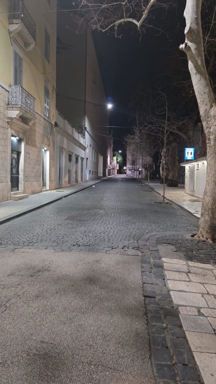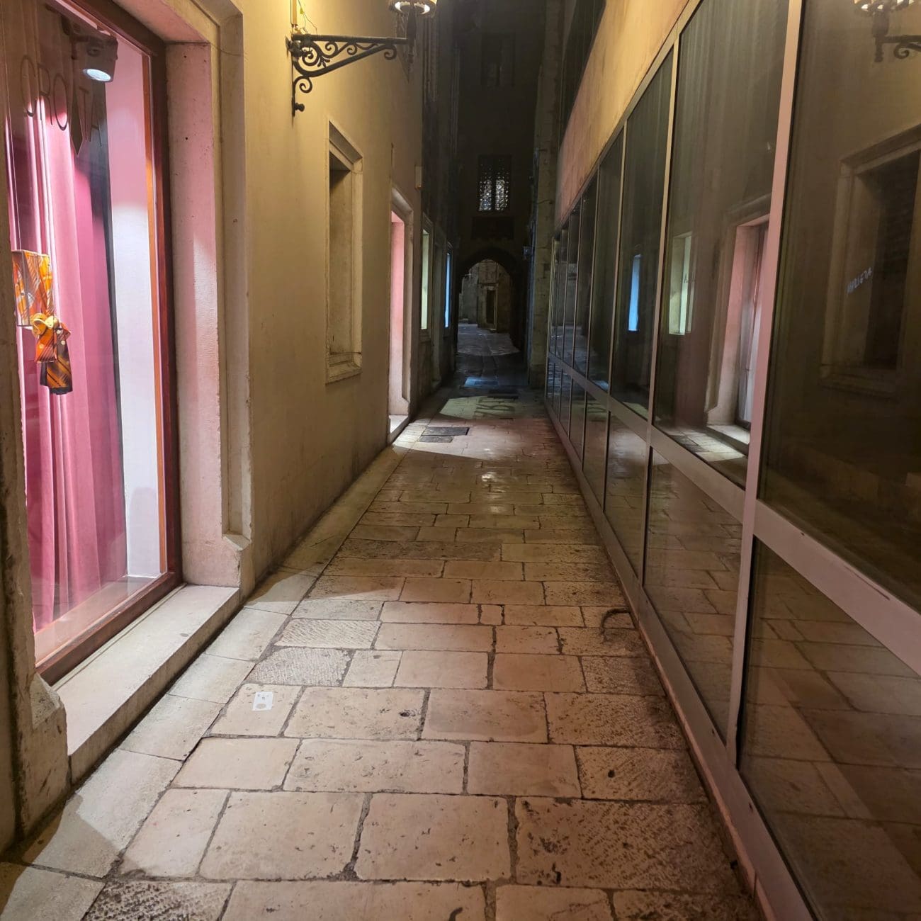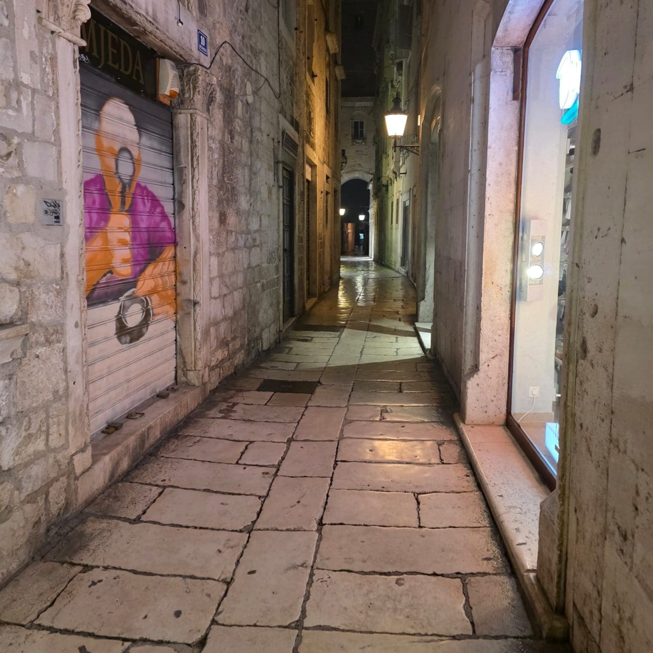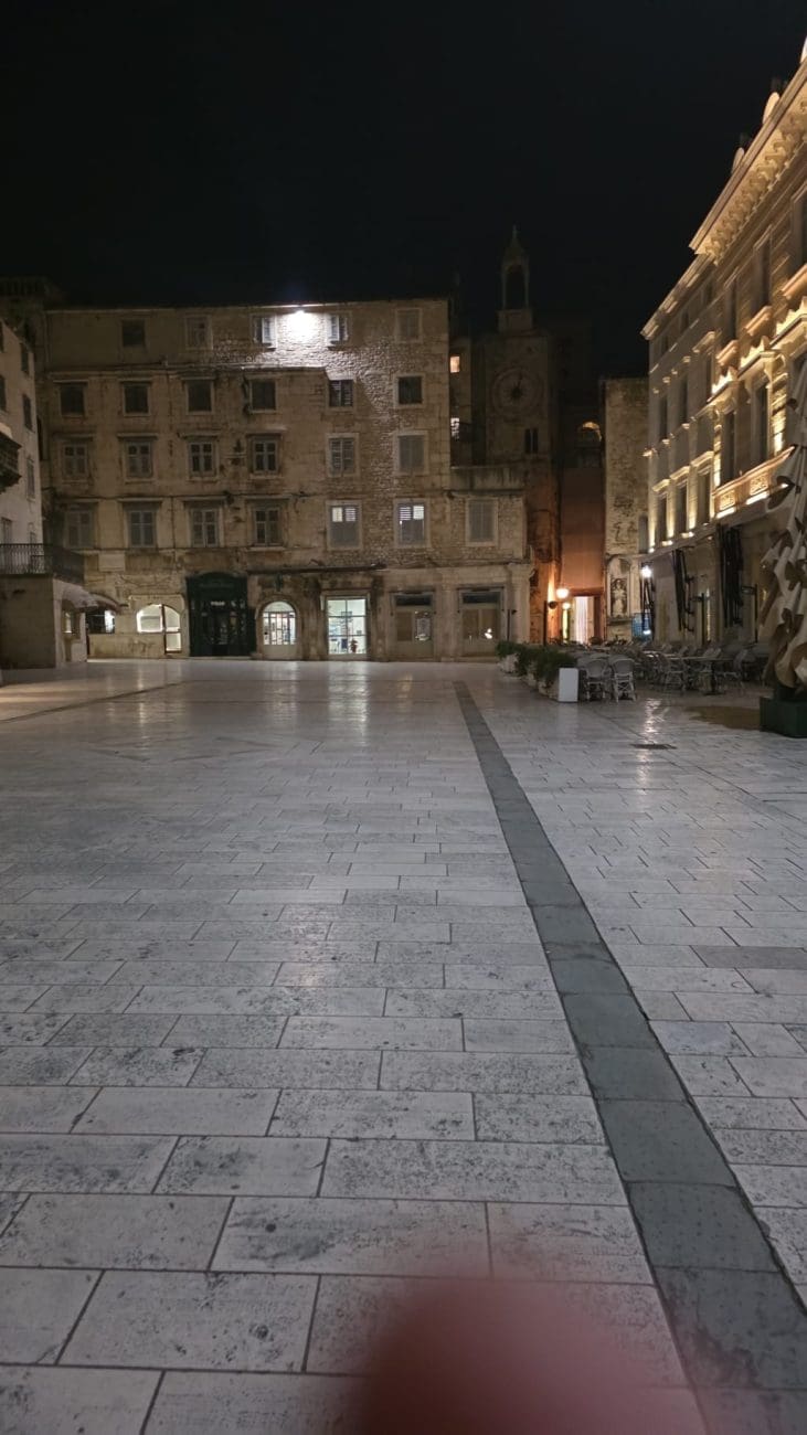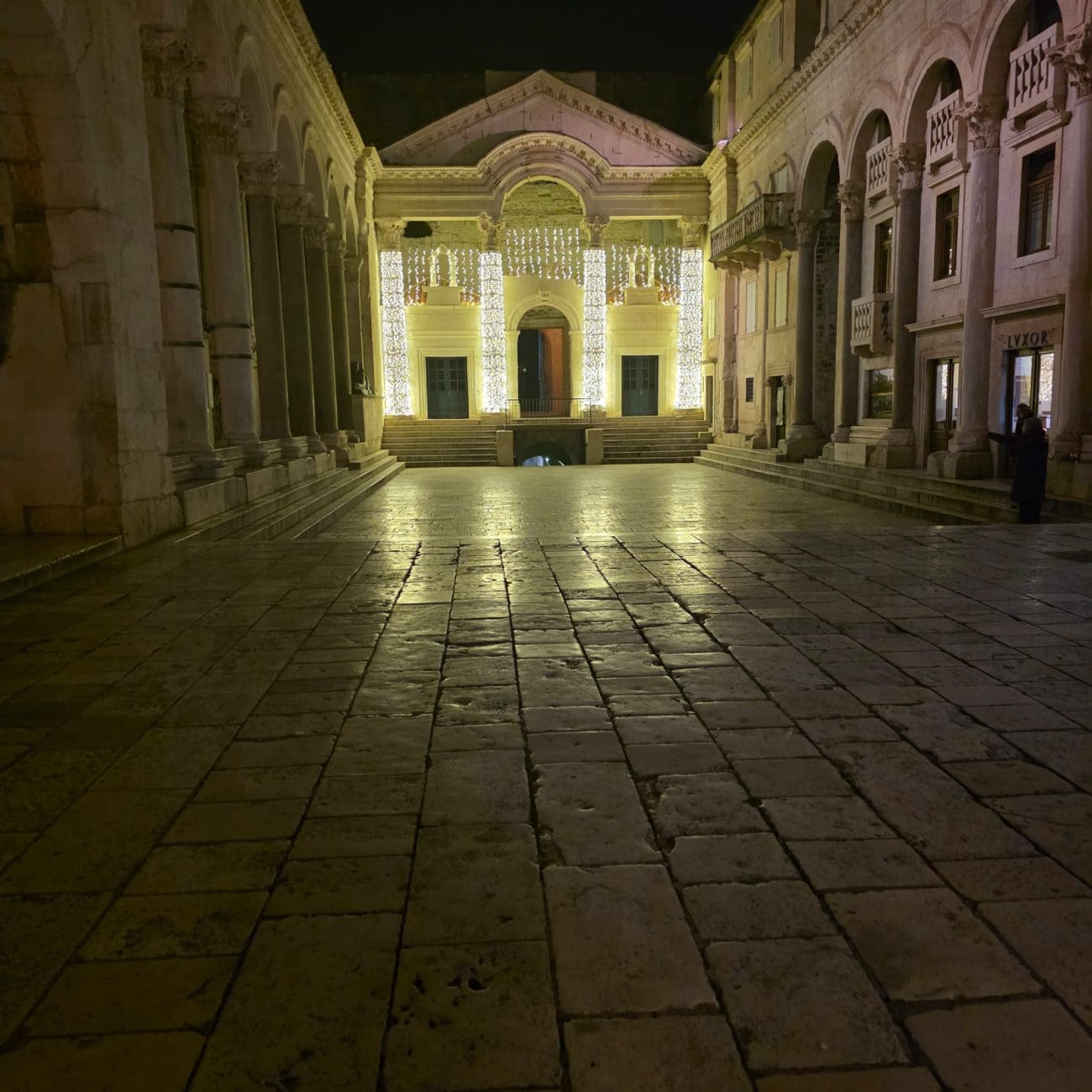 Dok ljetne večeri u Splitu vrve životom, zimske noći donose sasvim drugačiju sliku grada. Ulice u samom srcu Splita, inače ispunjene koracima, glasovima i smijehom, sada su tihe i gotovo potpuno prazne. Kamene ploče blago sjaje pod svjetlima javne rasvjete, a redovi lampi naglašavaju mir koji zimi zavlada gradskim središtem.