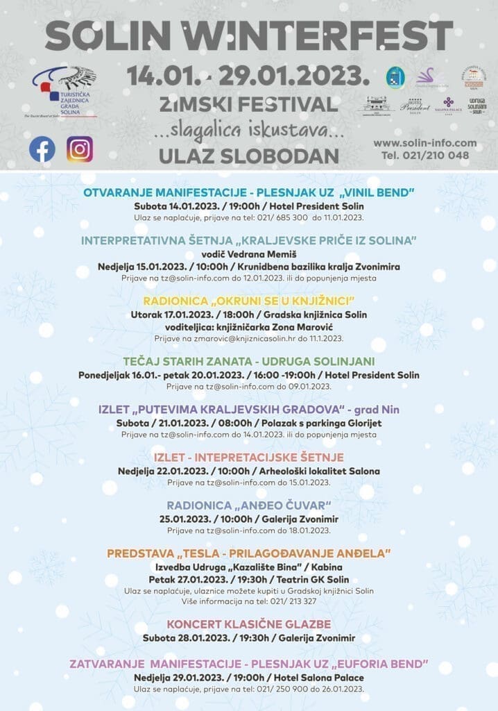 Program Solin winterfesta se sastoji od 10 događanja (plesnjaci, tečaj starih zanata, interpretacijske šetnje, radionice, izleti, predstava te koncert), koji će se održavati u zatvorenim prostorima grada Solina od hotela, Teatrina GK Solin, Doma kulture Zvonimir, ali i na otvorenim prostorima poput Salone ili Krunidbene bazilike kralja Zvonimira.