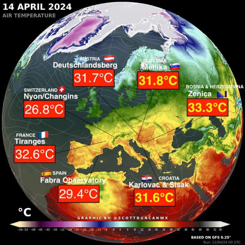 Iznimno topla zračna masa danima podržava visoke temperature koje su karakteristične za lipanj. Ne čudi stoga da su jučer ne samo u Hrvatskoj, nego u velikom dijelu južne Europe zabilježene najviše temperature zraka ikada izmjerene u travnju.