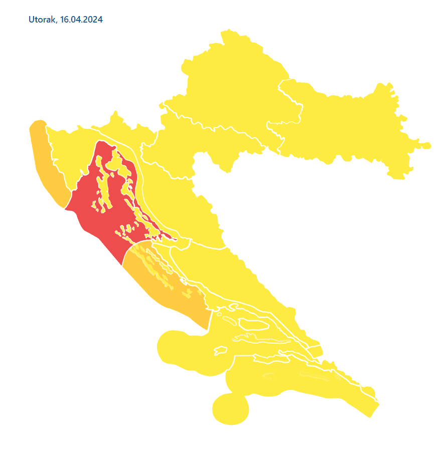 DHMZ je, unutar sustava MeteoAlarm, već za utorak izdao crveni stupanj upozorenja za more sjevernog Jadrana zbog juga, a za ostatak obale žuti i narančasti.