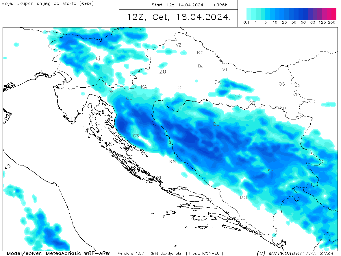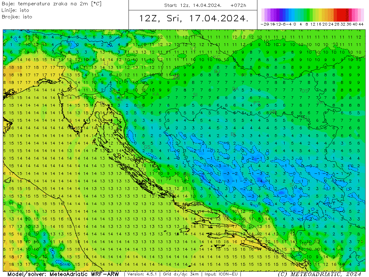 Glavnina pogoršanja vremena očekuje nas u srijedu. Bit će umjereno do znatno oblačno povremenu uz kišu, pljuskove i grmljavinu. Najmanje kiše na vanjskim otocima, a najviše na krajnjem jugu Dalmacije gdje do kraja dana može pasti preko 100 litara po metru kvadratnome. Na Dinari, Kamešnici, Svilaji i i Biokovu do kraja dana past će snijeg u višim predjelima, ali je navečer snježna granica moguća i niže. Jugo će okretati na buru, na otvorenom moru i tramontanu, a na jugu Dalmacije u početku može biti lebića. Osjetno hladnije od ranog jutra. Toplina će se najdulje zadržati južnije od Makarske, ali će i tamo postupno zahladiti. Sredinom dana temperature u Dalmaciji od 3°C ponegdje u višim predjelima Zagore do 17°C na jugu.