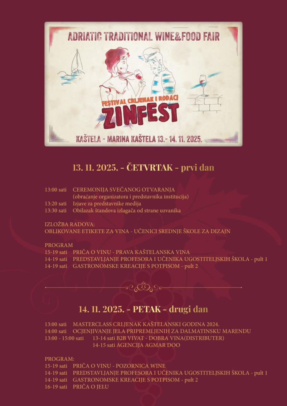Ovogodišnje peto izdanje Zinfesta održat će se od 13. do 15. studenog u Marini Kaštela, i nanovo će okupit vinare, vinogradare i ljubitelje vina iz cijele regije kako bi svjedočili novom značaju Crljenka kaštelanskog, direktnog pretka u svijetu priznatog i slavnog Zinfandela. Uz bogat enološko-gastronomski program, festival donosi i natjecanje u pripremi dalmatinske marende, što dodatno ističe tradiciju i povezanost Kaštela s globalnom vinskom i gastro scenom. Na današnjoj konferenciji za medije koja se održala u restoranu Spinnaker u Marini Kaštela, glavni akteri predstavili su program za nadolazeću manifestaciju.