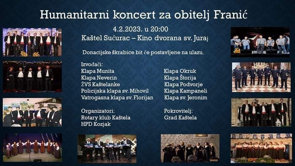 "Prvi koncert održat će se u sportskoj dvorani Sokolana u organizaciji HPD Kozjak i Rotary kluba Kaštela, uz potporu Grada Kaštela. Sponzori su još Zračna luka Split i Cemex, a pomogla je i Udruga Kampanel. Glavni pokrovitelj je Grad Kaštela. Nastupit će Zorica Kondža i Joško Banov, Hari Rončević, Ivo Amulić i Bravo Bend. Cijena ulaznice je 7 eura. Simbolična je, a također postoji i račun na koji se može uplatiti donacija. Tako oni koji ne dođu na koncert ipak mogu dati svoj prilog za ovu obitelj", kazao nam je Petar Pilić iz Bravo Benda.