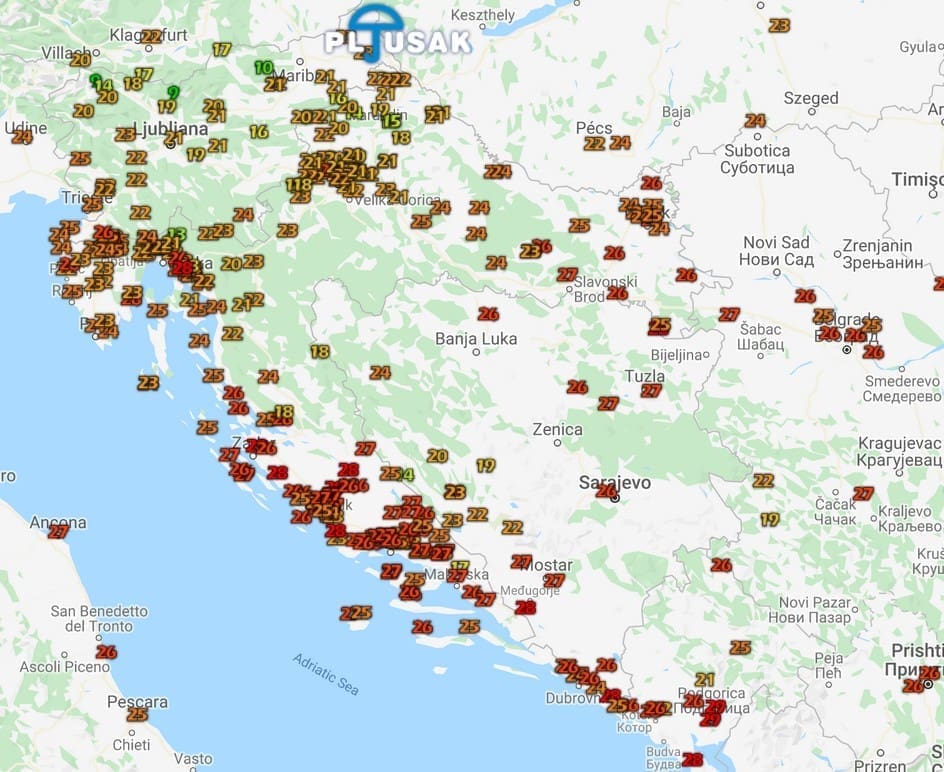 Dan obilježava natprosječna toplina pa su najviše dnevne temperature zraka posvuda bile između 25 i vrlo toplih 28°C, koliko je izmjereno danas u okolici Splita.