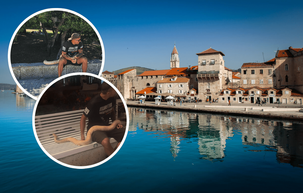Na neobičan i nimalo ugodan prizor danas su u Trogiru naletjeli brojni domaći, ali i gosti. Gospodin koji je u srijedu na splitsku rivu donio ogromnu zmiju koju najvjerojatnije drži kao kućnog ljubimca danas je tu istu zmiju sa sobom poveo u Trogir.