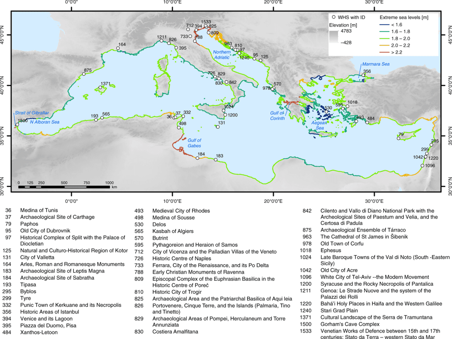 Kako se može vidjeti iz opsežne analize i procjene ugroženosti, trenutno 49 zaštićenih lokacija svjetske baštine smještenih uz obalu nije ugroženo, 37 lokacija je ugroženo zbog dizanja razine mora, a erozija prijeti njih 42. Do 2100. godine opasnost od plavljenja povećat će se za 50 posto, a od erozije za 13 posto u cijeloj regiji. Od lokacija koje su ugrožene najviše ih je iz Italije (15), Hrvatske (7), Grčke (4) i Tunisa (4).