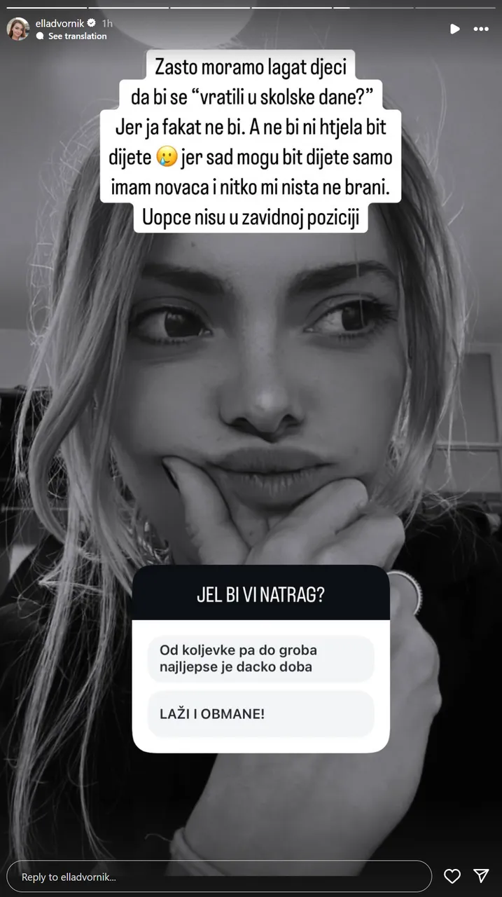 "Zašto moramo lagati djeci da bi se vratili u školske dane? Jer ja stvarno ne bih. A ne bi ni htjela biti dijete jer sad mogu biti dijete, samo imam novaca i nitko mi ništa ne brani. Uopće nisu u zavidnoj poziciji", poručila je Ella, a zatim upitala pratitelje: "Biste li vi natrag?".