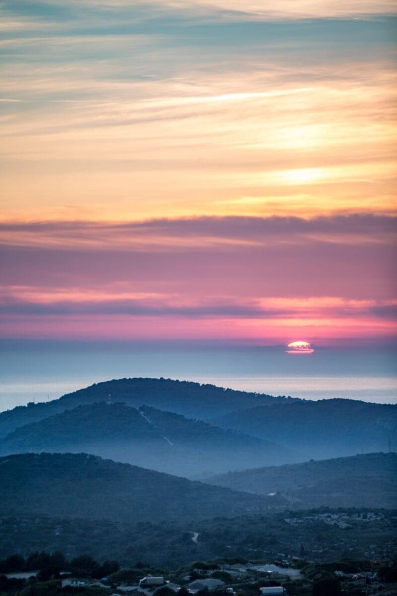 Nakon toplog proljetnog dana uslijedio je atraktivan smiraj dana u kojem se zalazeće Sunce naziralo kroz slojeve kolorizirane sumaglice. Prizor je iz Poljuna na Hvaru snimio fotograf Jakša Kuzmičić...