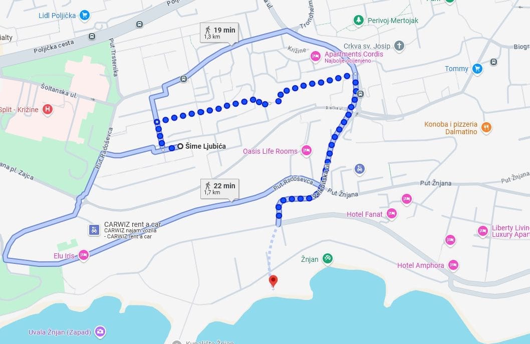 Doduše, s Mertojaka čak i ima pokoja prečica, uski neobilježeni putić po tuđoj zemlji, uz prozore tuđih kuća, između kupusa i rašćike i tankih lanaca gladnih pasa čuvara. Naravno, to nije za preporučiti nikome, a neće ni veliki Google. On će ponuditi cik - cak varijante od kojih su samo neke i to u kraćem dijelu pokrivene nogostupima gdje će ih dočekati električni bicikli i razne druge dvokolice. Kakve avanture nudi Google Splićanima i njihovim gostima ako su se ipak odlučili doći pješke na Žnjanski plato iz Šoltanske, Ljubićeve, Puta Svetog Lovre, Doverske, Biogradske, Papandopulove... pogledajte u galeriji.