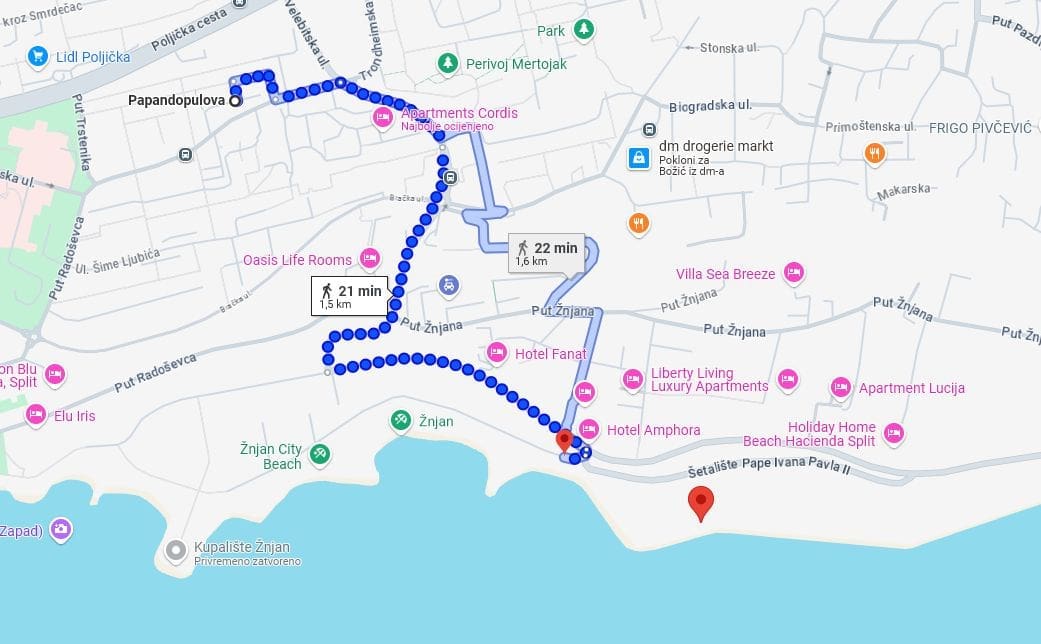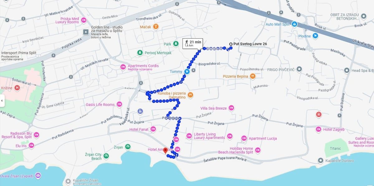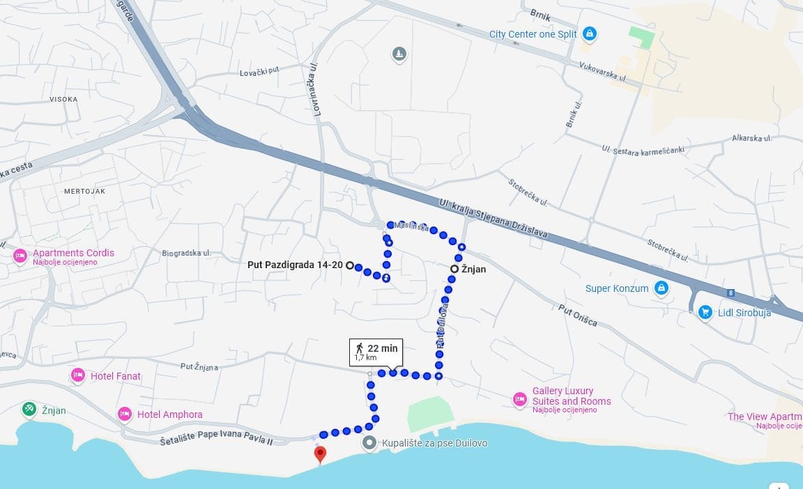 Doduše, s Mertojaka čak i ima pokoja prečica, uski neobilježeni putić po tuđoj zemlji, uz prozore tuđih kuća, između kupusa i rašćike i tankih lanaca gladnih pasa čuvara. Naravno, to nije za preporučiti nikome, a neće ni veliki Google. On će ponuditi cik - cak varijante od kojih su samo neke i to u kraćem dijelu pokrivene nogostupima gdje će ih dočekati električni bicikli i razne druge dvokolice. Kakve avanture nudi Google Splićanima i njihovim gostima ako su se ipak odlučili doći pješke na Žnjanski plato iz Šoltanske, Ljubićeve, Puta Svetog Lovre, Doverske, Biogradske, Papandopulove... pogledajte u galeriji.