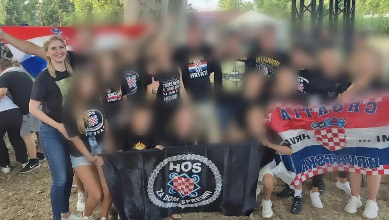 Zrinka Mužinić Bikić, državna tajnica u Ministarstvu obrazovanja, fotografirana je s društvom, među kojim su i maloljetna djeca, a nose HOS-ove majice s natpisom ZDS. U rukama drže istu takvu zastavu.