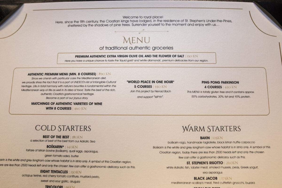 Prvi "Autohtoni Premium Menu" u osam sljedova objedinjuje cijelu Lijepu Našu, sve uz okuse mediteranske prehrane koja je upisana na UNESCO Reprezentativnu listu svjetske nematerijalne kulturne baštine. Drugi meni baziran je na Šoltanskom autohtonom ekstra djevičanskom maslinovom ulju koje je ove godine u New Yorku dobilo najveće priznanje u svijetu extra djevičanskih maslinovih ulja.
