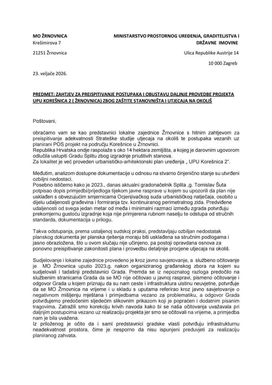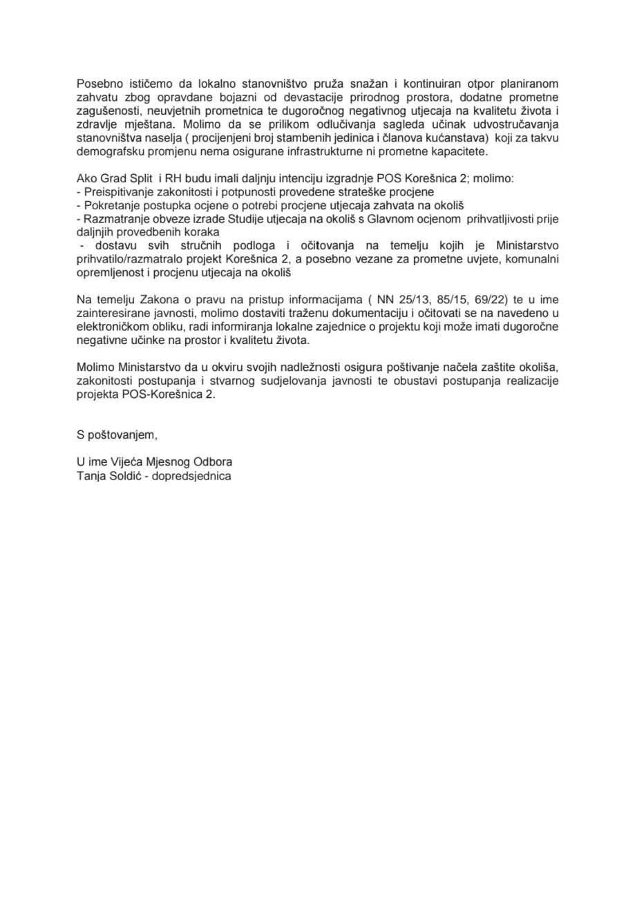 Nakon što je posljednjih dana projekt Korešnica 2 izazvao snažne reakcije dijela žrnovničke javnosti, dopredsjednica Mjesnog odbora Žrnovnica Tanja Soldić danas se ponovno oglasila, ovaj put najavljujući konkretne korake prema državnim institucijama.