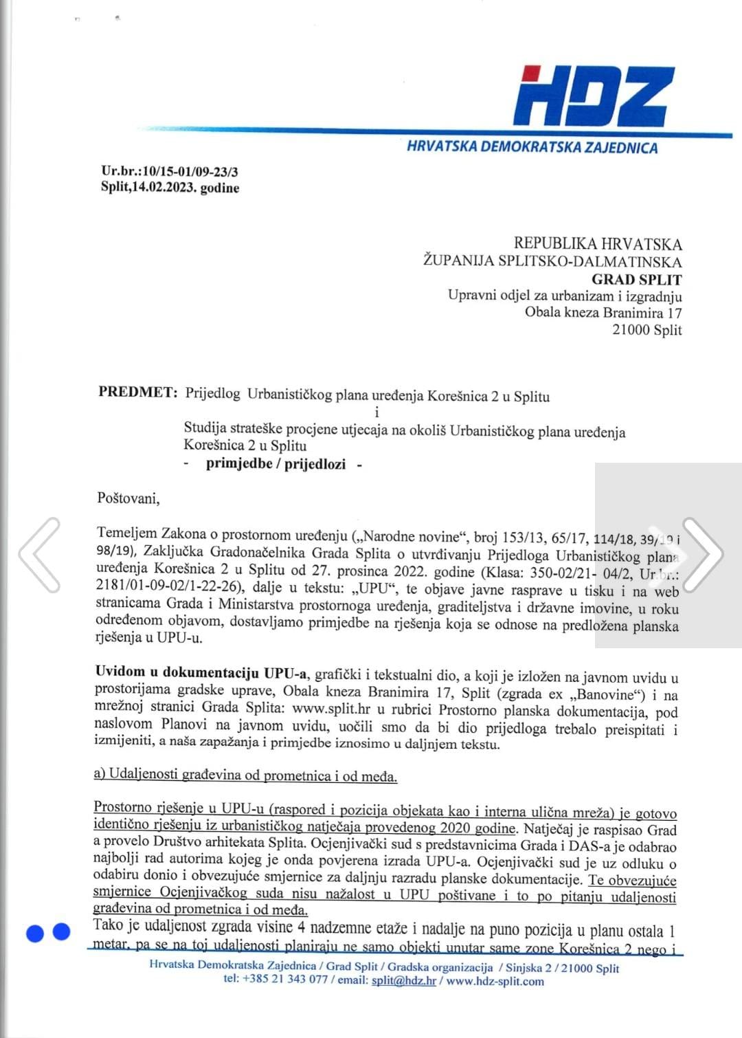 Dodaje da Mjesni odbor raspolaže dokumentacijom koja, prema njezinim riječima, potvrđuje da su primjedbe dostavljene u predviđenom roku.