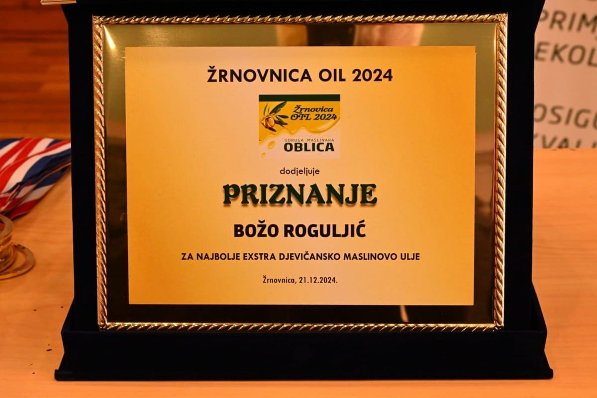 Dobitnici zlatnih medalja za ekstra djevičansko maslinovo ulje: Najveći uspjeh ostvario je Božo Roguljić, čije je ulje proglašeno najboljim ovogodišnjim uljem, čime je ponio titulu prvaka manifestacije „Žrnovnica Oil 2024“. Zlatne medalje pripale su i Ivanu Mihanoviću, Petru Pavliću, Anđi Lončar te mnogim drugim maslinarima koji su svojim radom pokazali predanost kvaliteti.