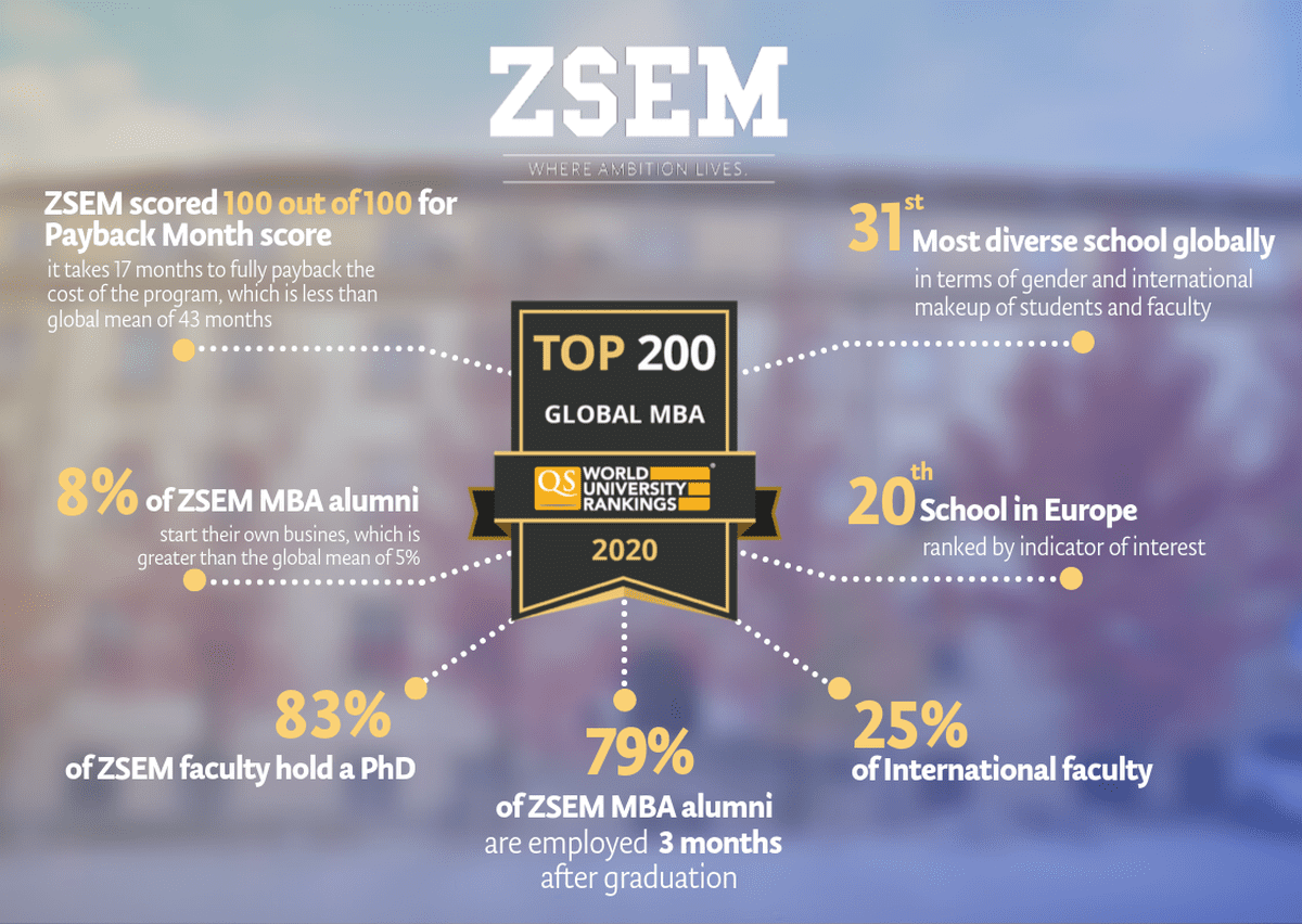 Na ZŠEM-u ističu kako su ponosni zbog velikog uspjeha svoga MBA studija koji je prepoznat i ocijenjen među 150 do 200 najboljih programa u svijetu. ZŠEM je prva visokoškolska ustanova iz Hrvatske kojoj je uspjelo ući u jedno od najprestižnijih svjetskih rangiranja (QS).